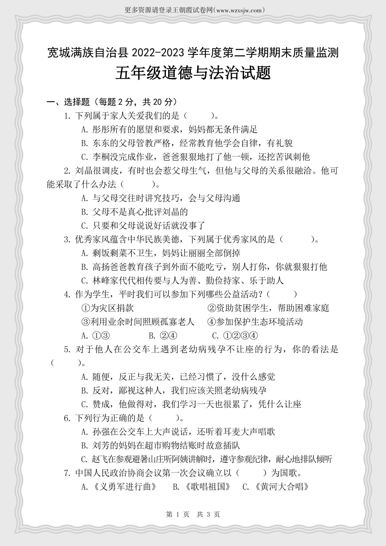河北省承德市宽城满族自治县2022-2023学年度第二学期期末质量监测试题五年级道德与法治(人教版)