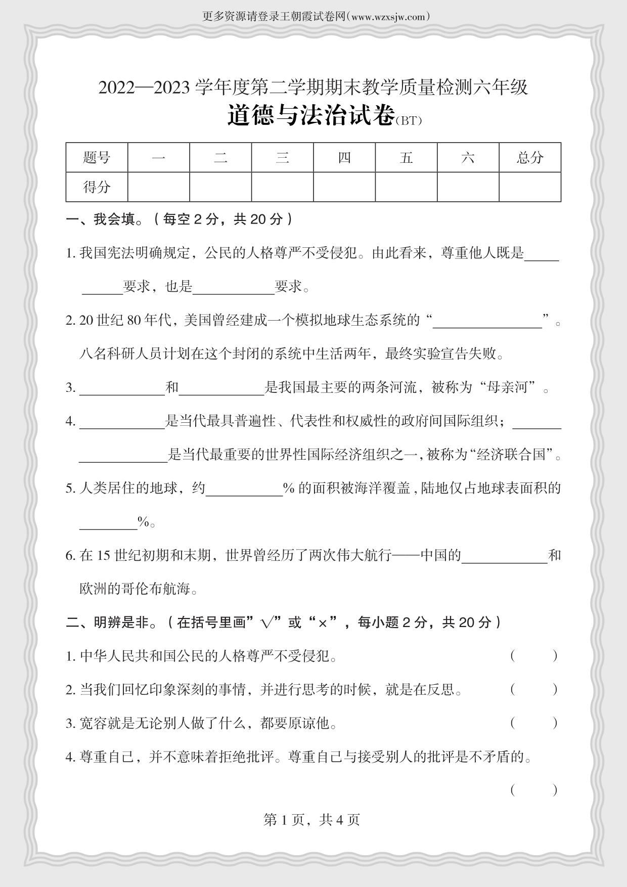 河北省沧州市泊头市2022-2023学年度第二学期期末教学质量检测试卷六年级道德与法治(人教版)