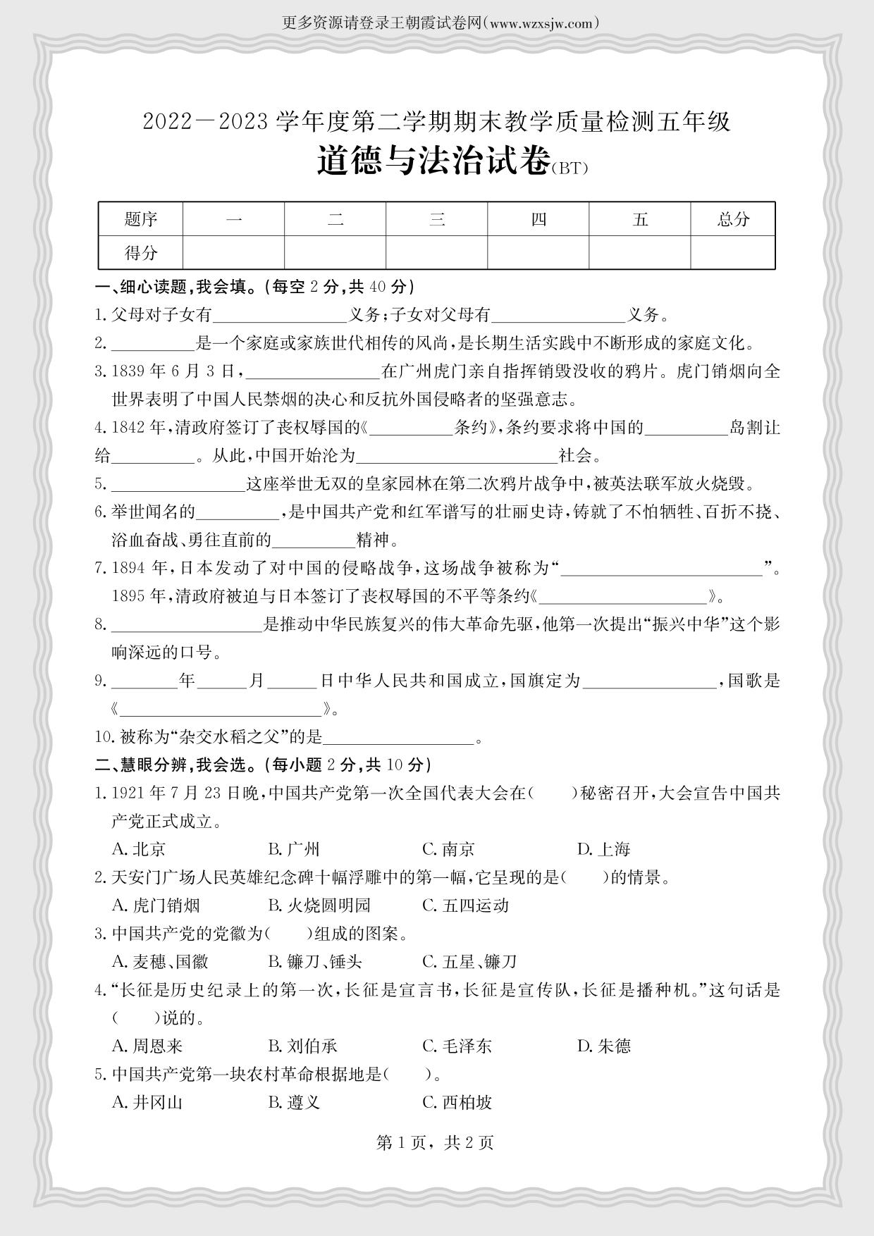 河北省沧州市泊头市2022-2023学年度第二学期期末教学质量检测试卷五年级道德与法治(人教版)