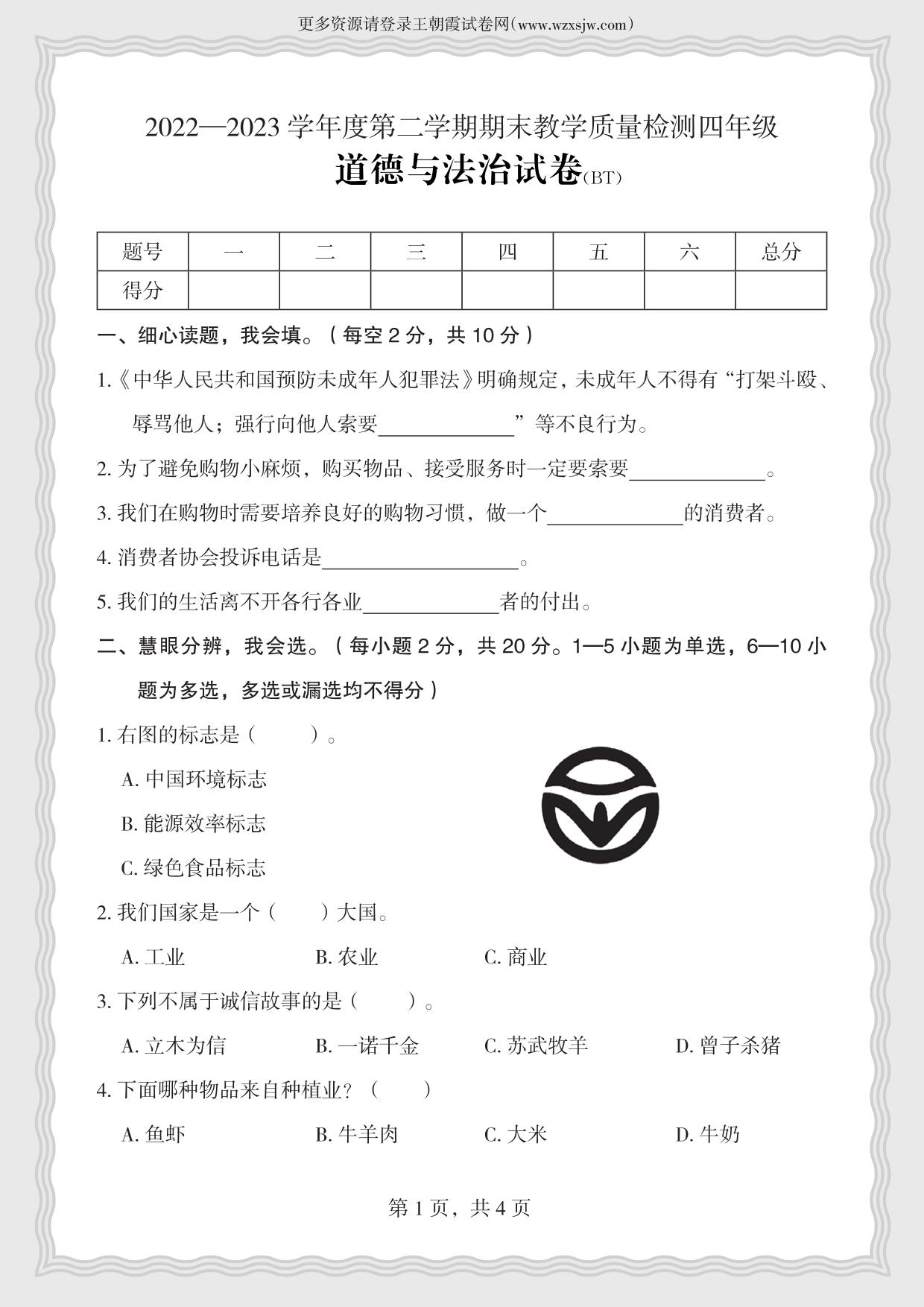 河北省沧州市泊头市2022-2023学年度第二学期期末教学质量检测试卷四年级道德与法治(人教版)