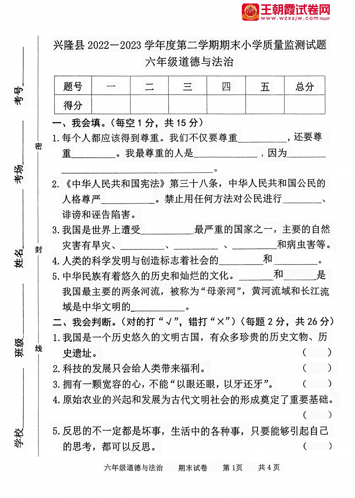河北省承德市兴隆县2022-2023学年度第二学期期末小学质量监测试题六年级道德与法治(人教版)