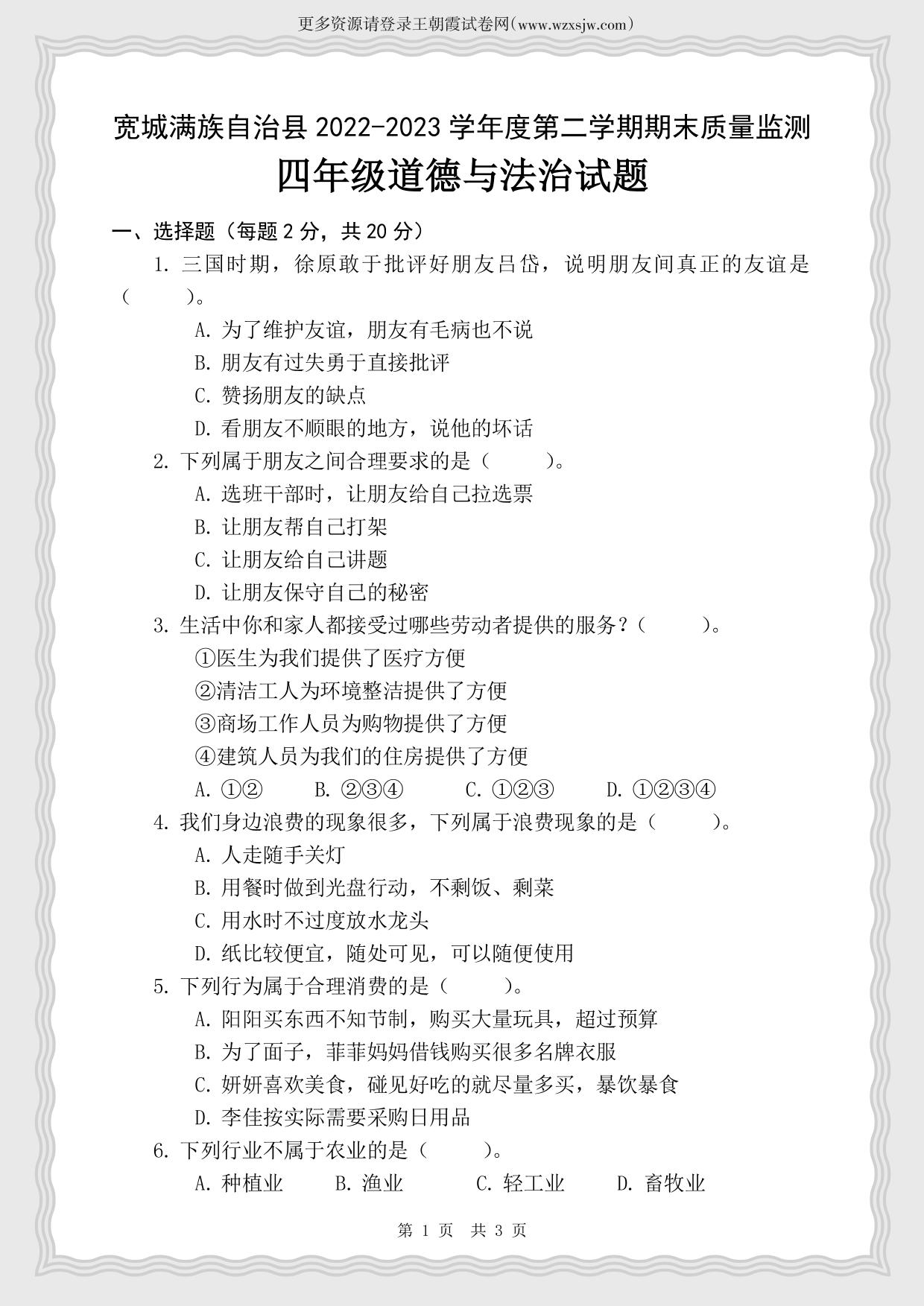 河北省承德市宽城满族自治县2022-2023学年度第二学期期末质量监测试题四年级道德与法治(人教版)