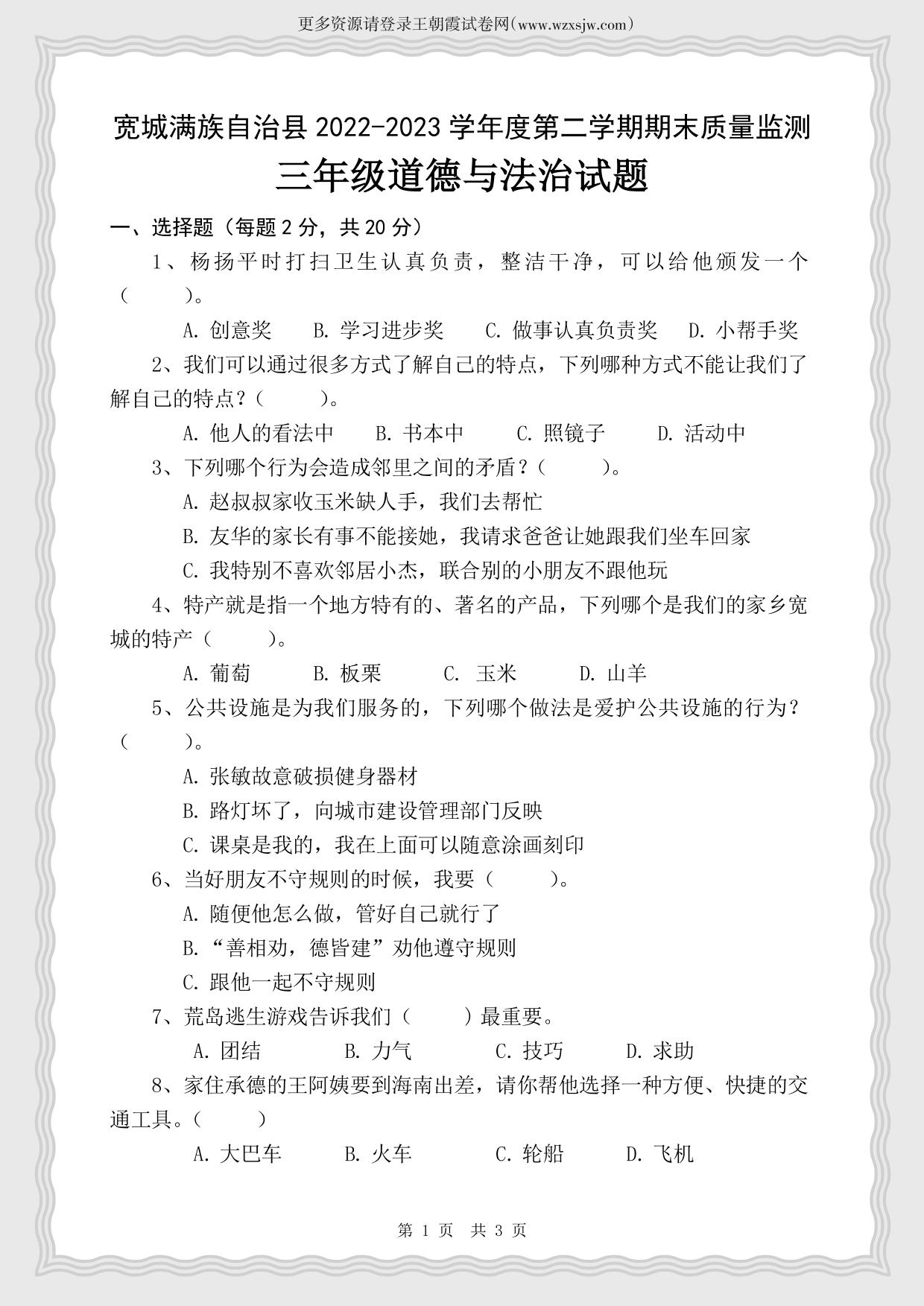 河北省承德市宽城满族自治县2022-2023学年度第二学期期末质量监测试题三年级道德与法治(人教版)