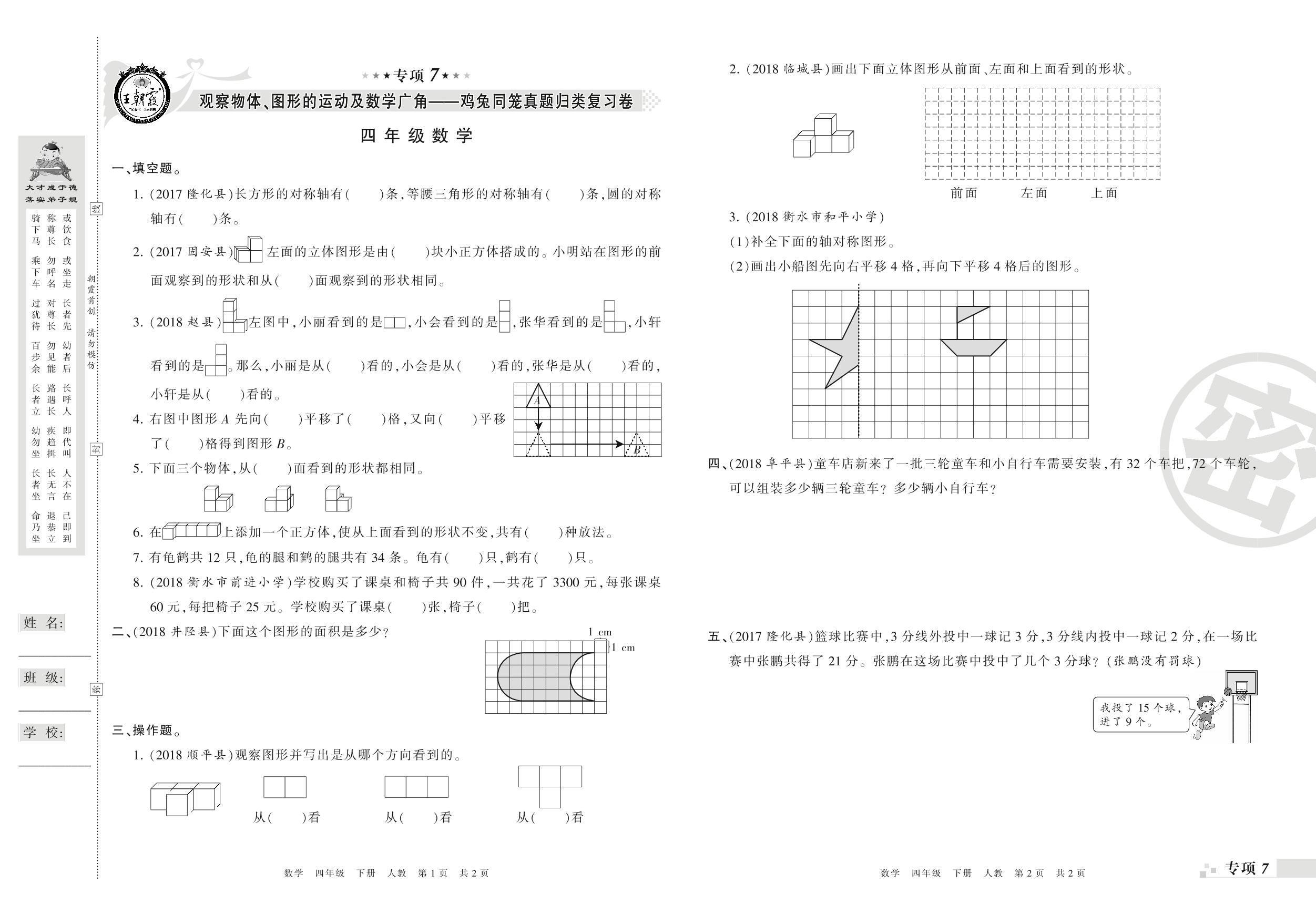 王朝霞期末专项卷——观察物体、图形的运动及数学广角:鸡兔同笼 平均数与条形统计图真题归类复习卷四年级下册数学(人教版)_R210804145456【0】