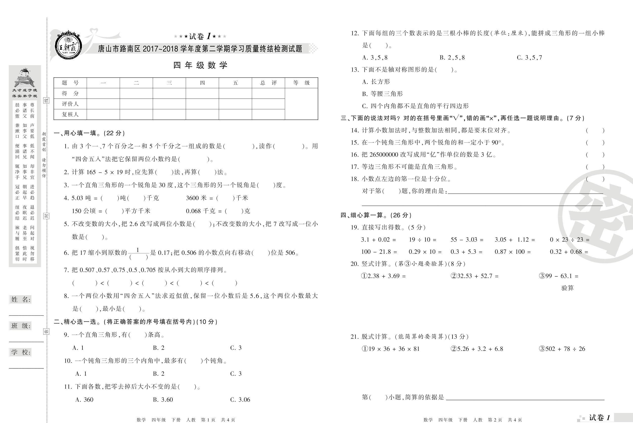 2017-2018学年第二学期唐山市唐山路路南区四年级数学试卷(人教版)【1】