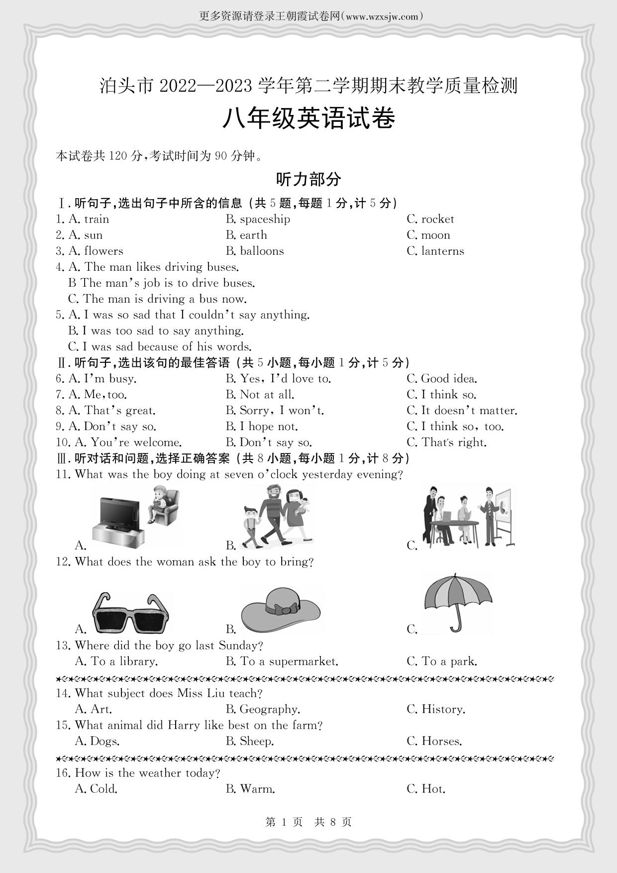 河北省沧州市泊头市2022-2023学年度第二学期期末教学质量检测试卷八年级英语(冀教版)【无听力音频】