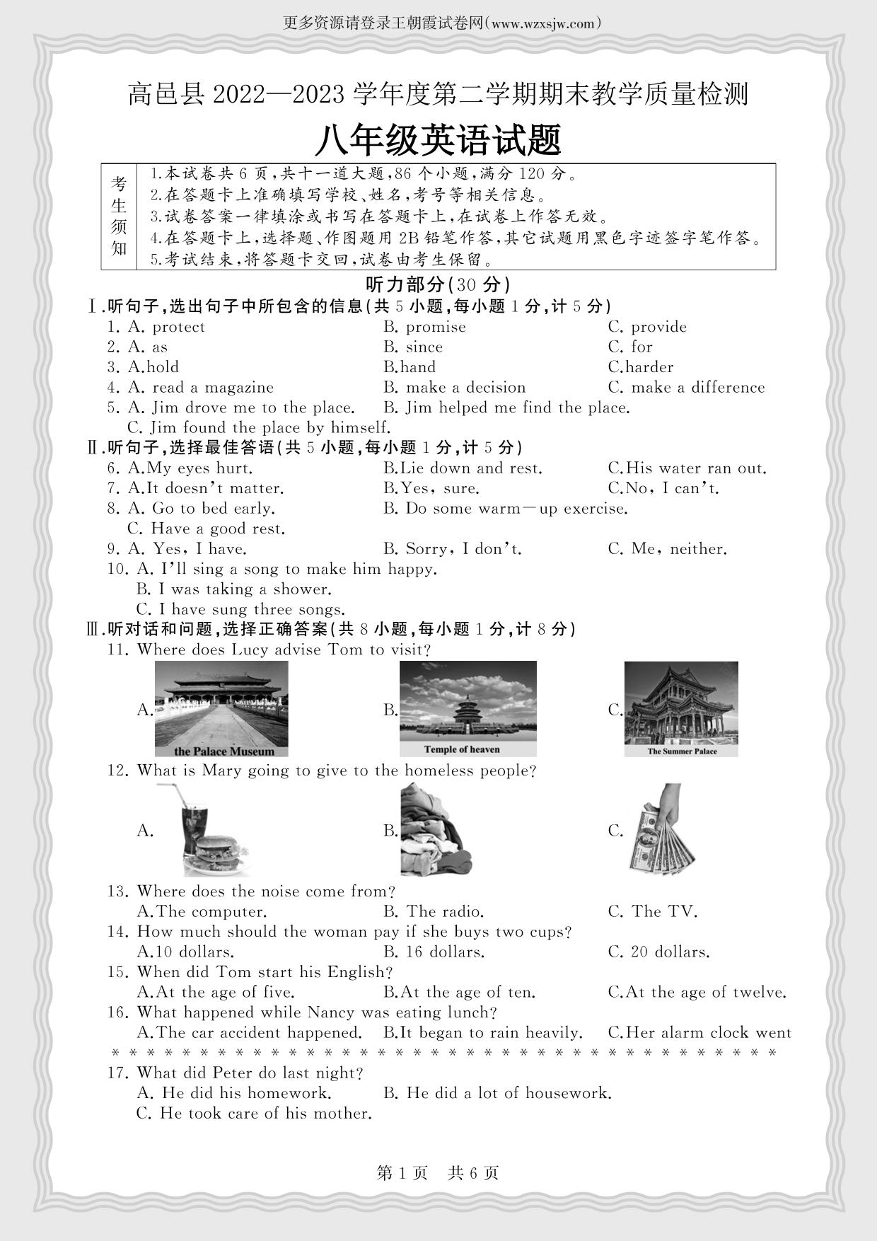河北省石家庄市高邑县2022-2023学年度第二学期期末教学质量检测试题八年级英语(人教版)