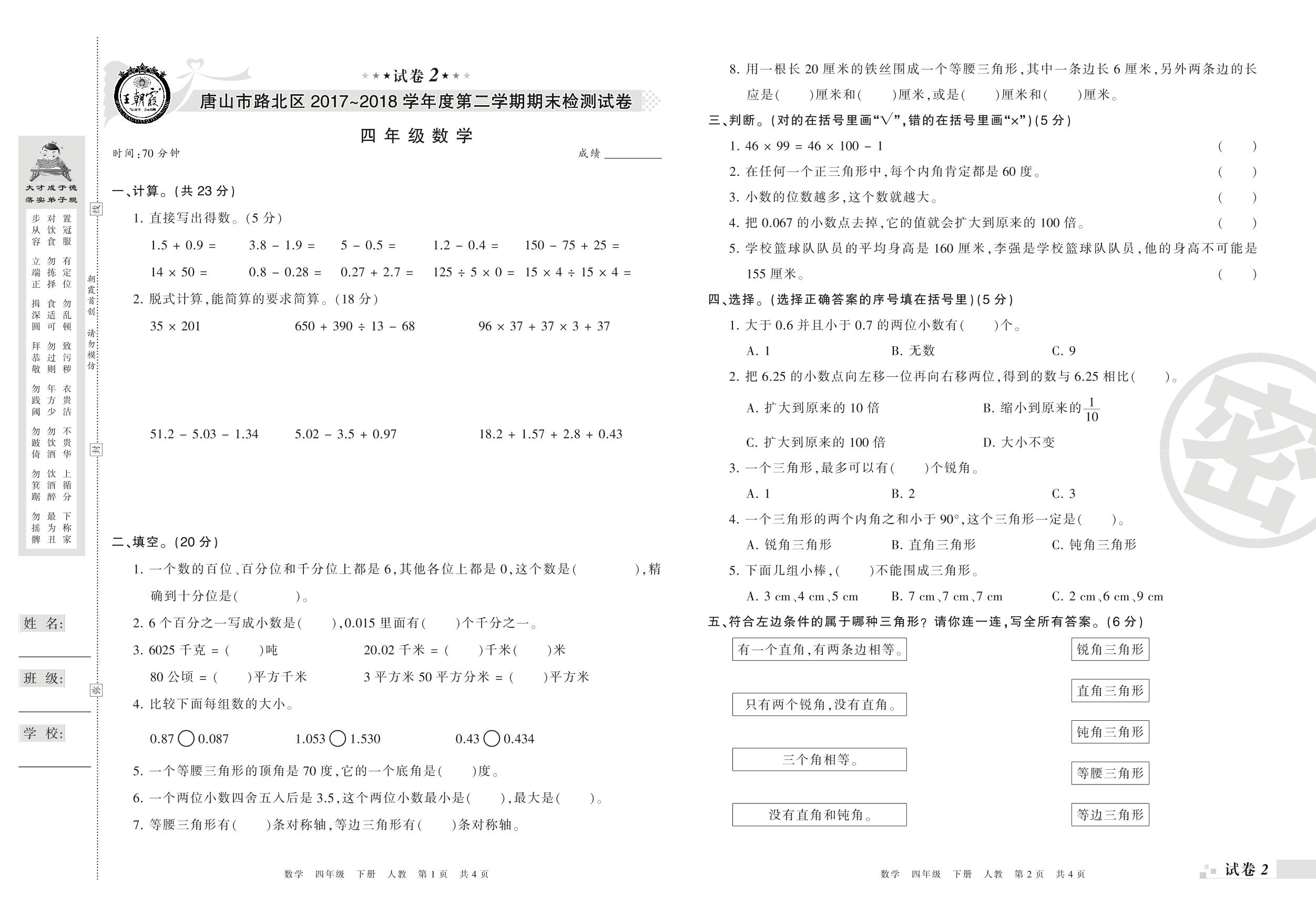 2017-2018学年第二学期唐山市路北区四年级数学试卷(人教版)【2】