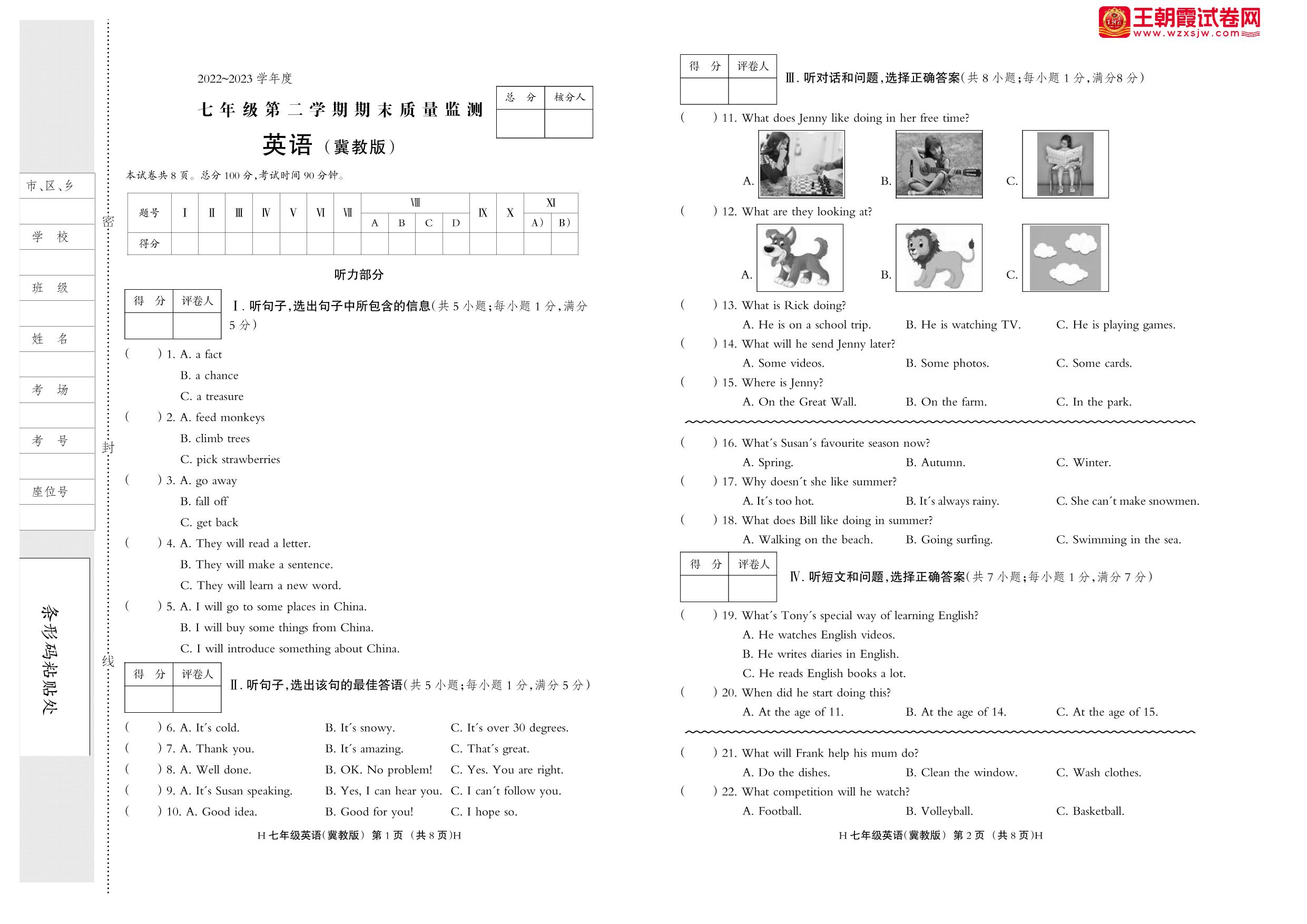 河北省张家口市怀安县2022-2023学年度第二学期期末质量监测试题七年级英语(冀教版)