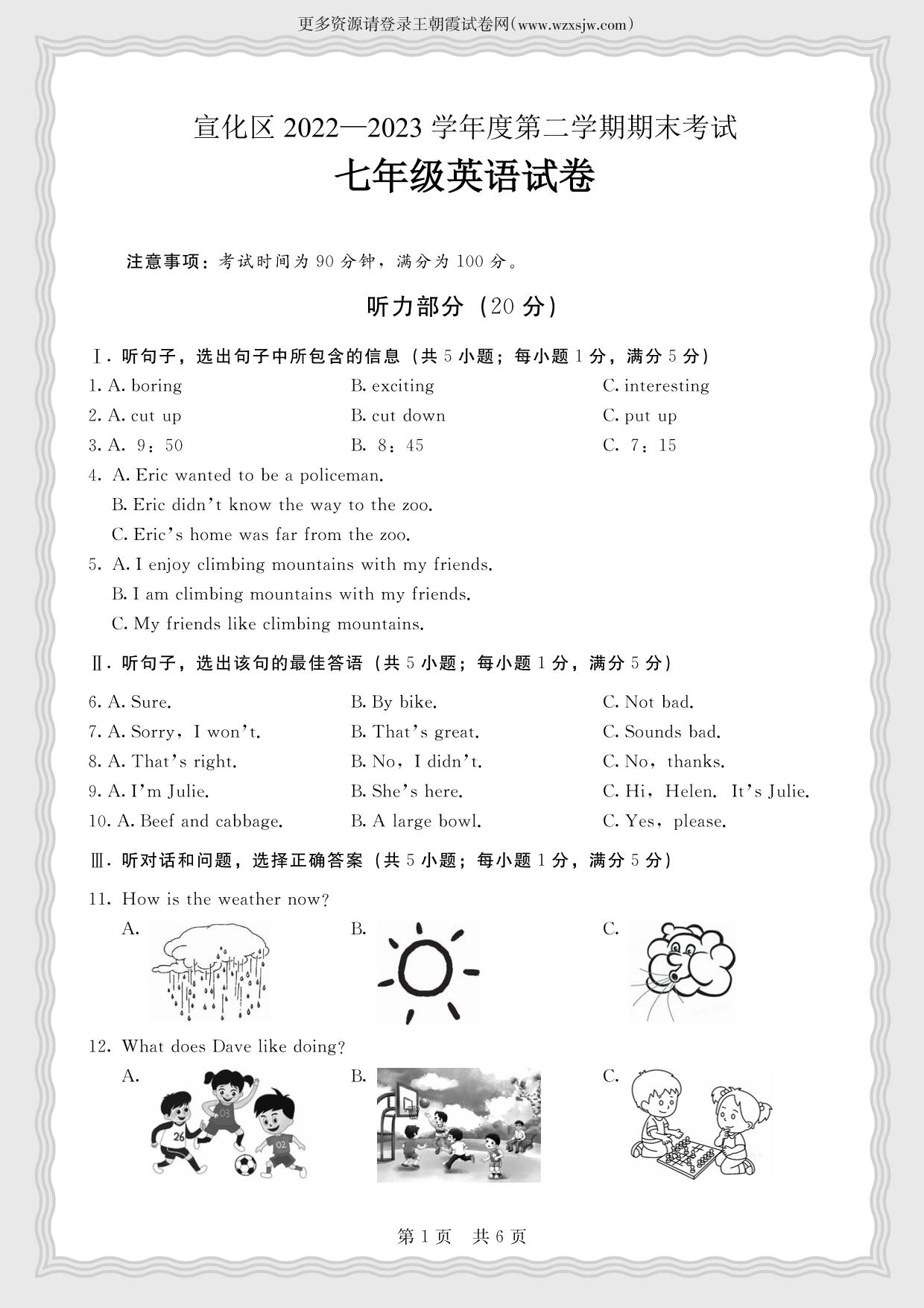 河北省张家口市宣化区2022-2023学年度第二学期期末考试试卷七年级英语(人教版)【无听力音频】