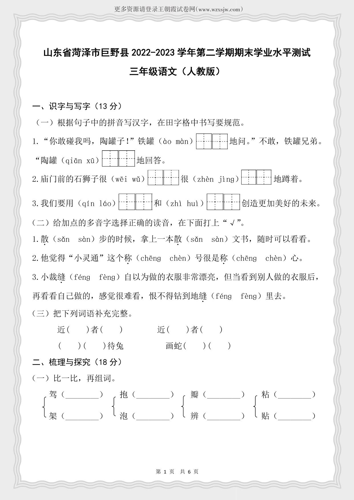 山东省菏泽市巨野县2022-2023学年第二学期期末学业水平测试三年级语文(人教版)