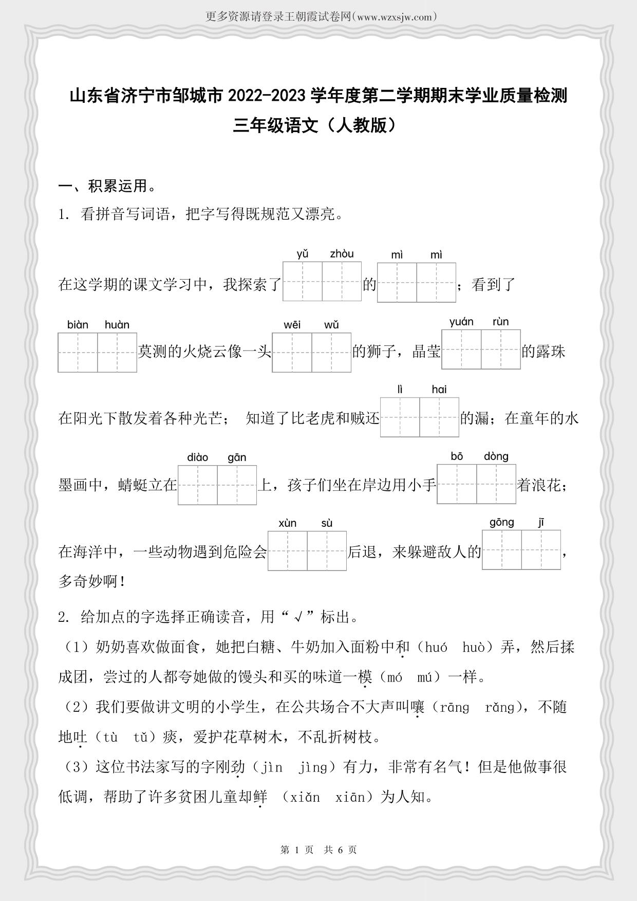 山东省济宁市邹城市2022-2023学年度第二学期期末学业质量检测三年级语文(人教版)