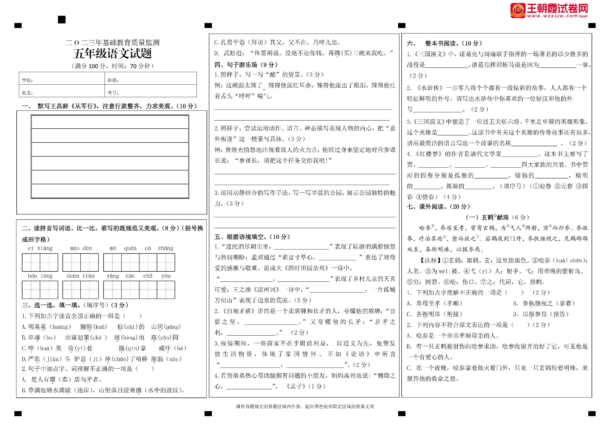 山东省济宁市泗水县2022-2023学年下学期期末基础教育质量监测五年级语文(人教版)