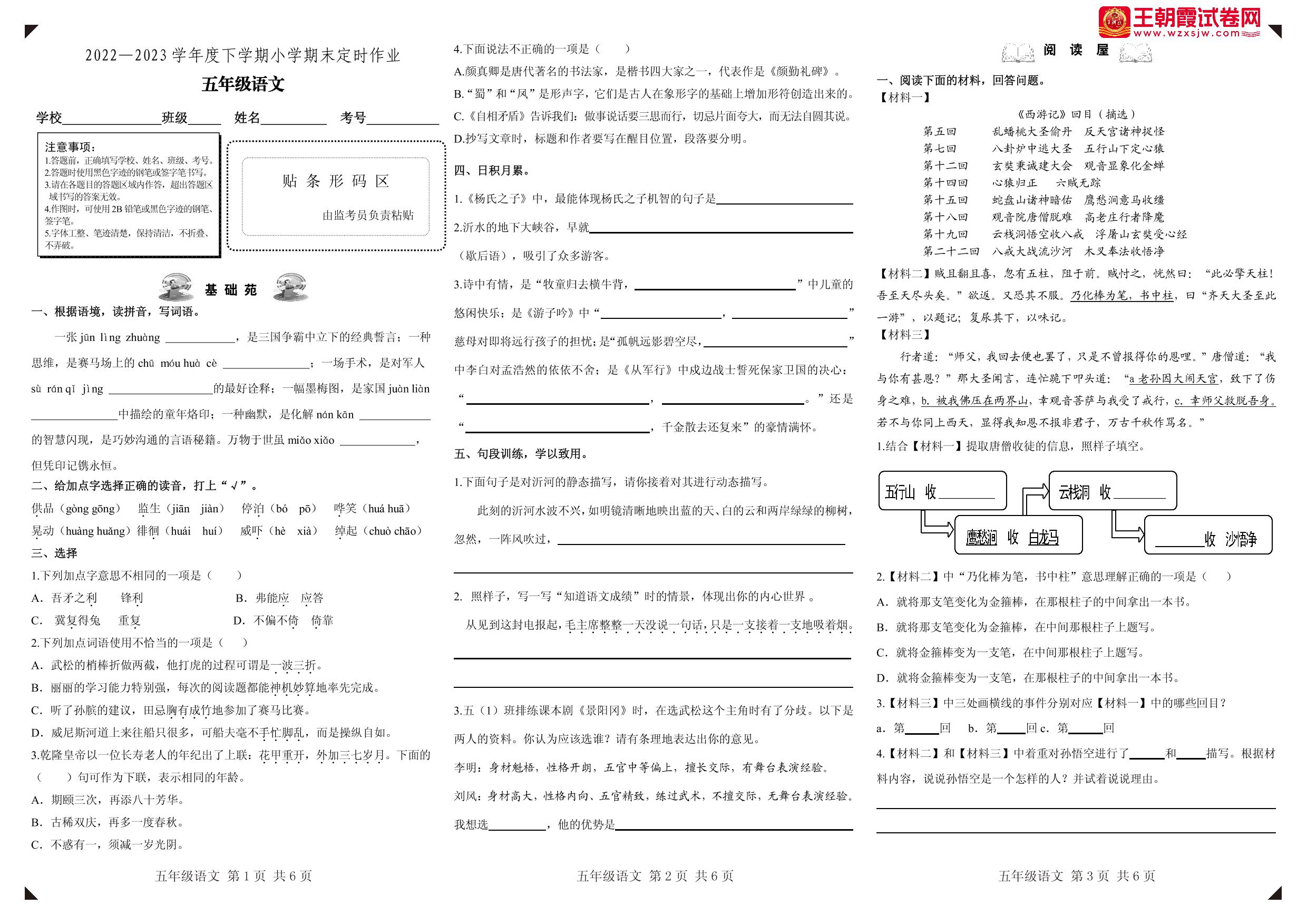 山东省临沂市沂水县2022-2023学年度下学期期末定个时作业五年级语文(人教版)
