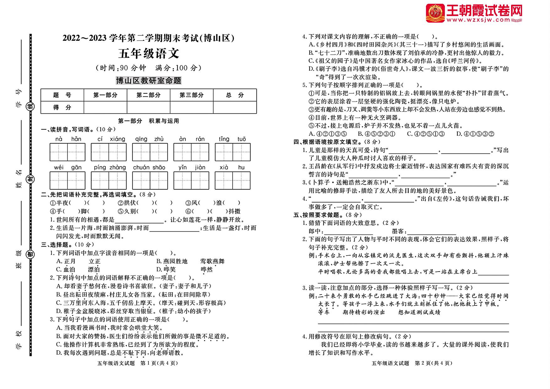 山东省淄博市博山区2022-2023学年第二学期期末考试五年级语文(人教版)