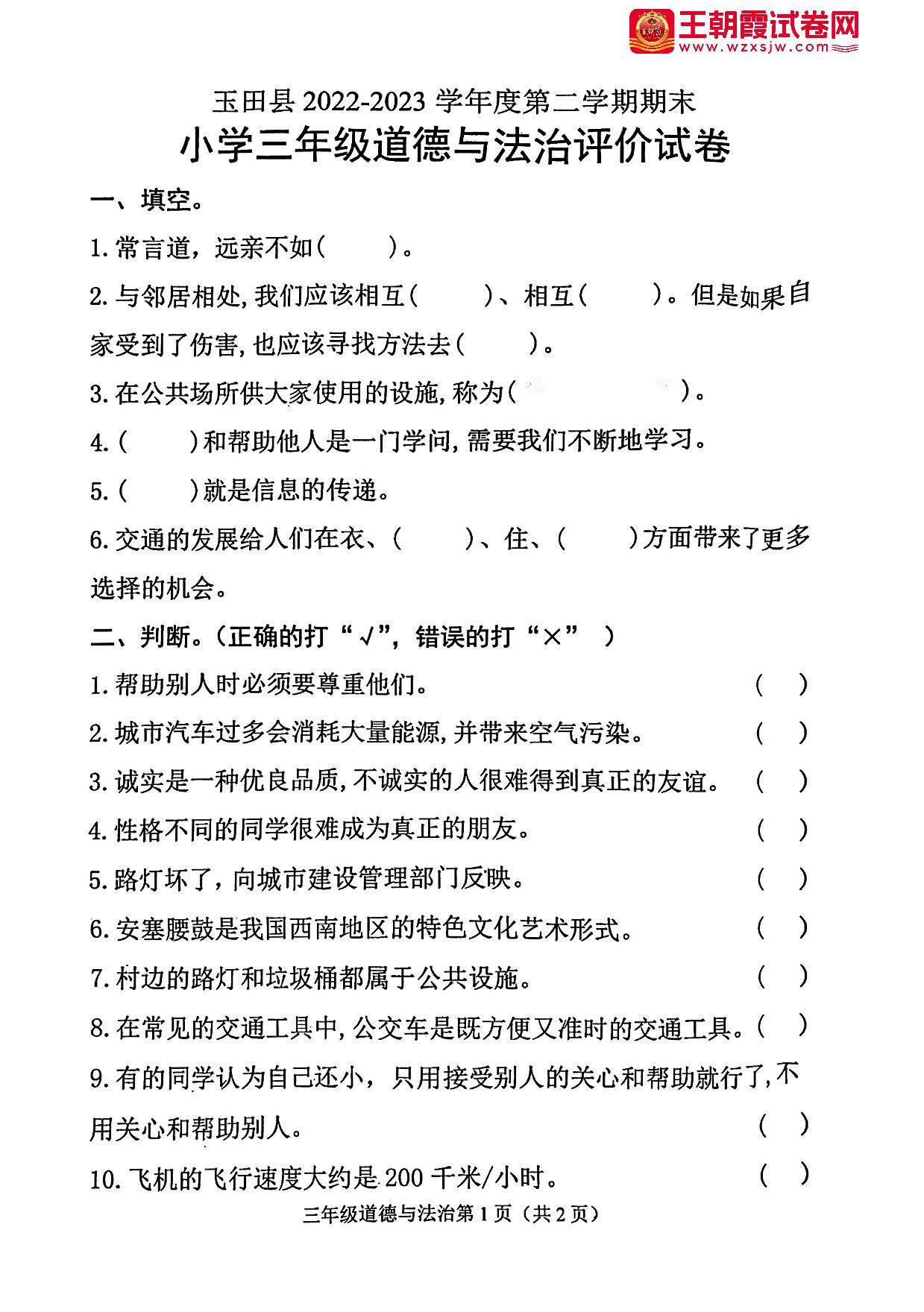 河北省唐山市玉田县2022-2023学年度第二学期期末评价试卷三年级道德与法治(人教版)