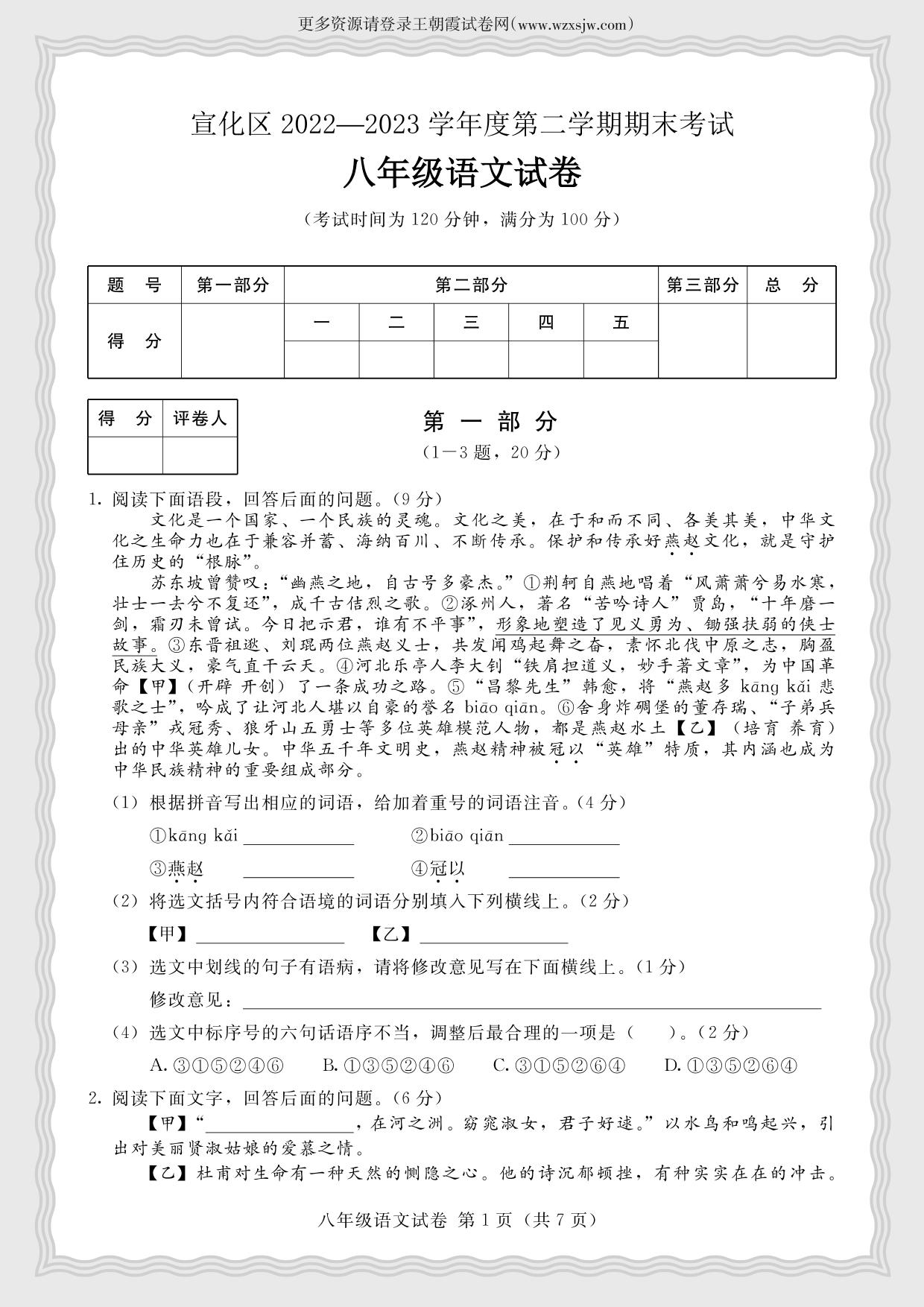 河北省张家口市宣化区2022-2023学年度第二学期期末考试试卷八年级语文(人教版)