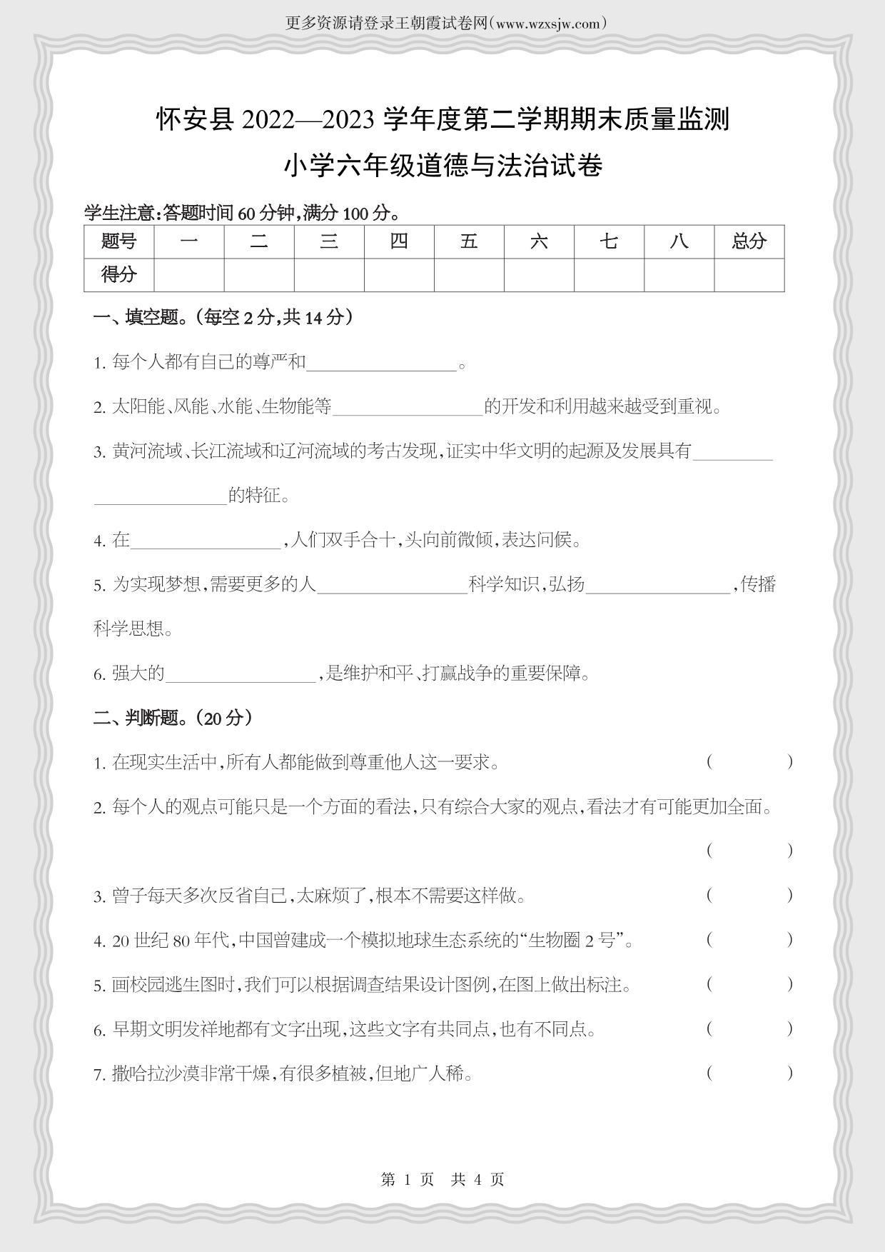 河北省张家口市怀安县2022-2023学年度第二学期期末质量检测试卷六年级道德与法治(人教版)