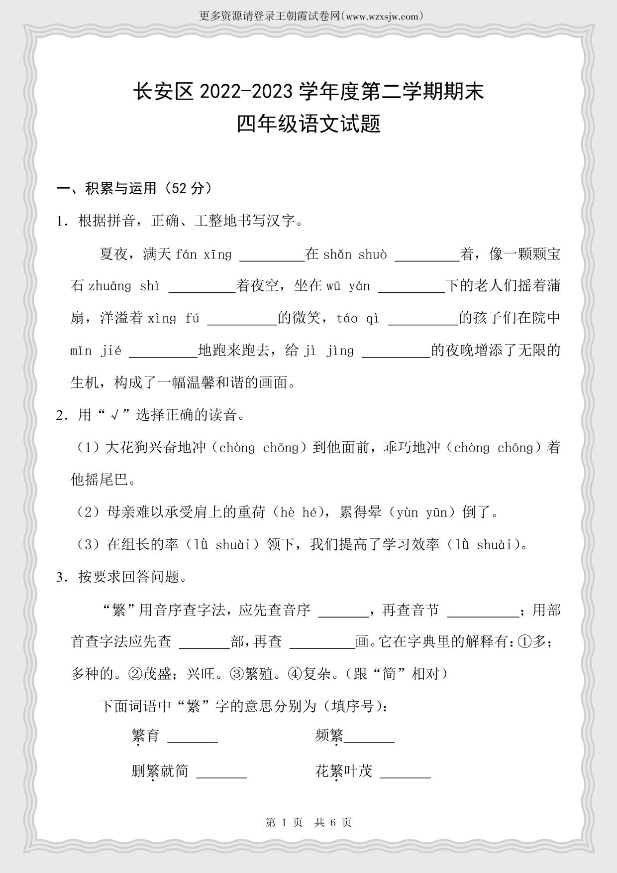 陕西省西安市长安区2022-2023学年度第二学期期末试题四年级语文(人教版)