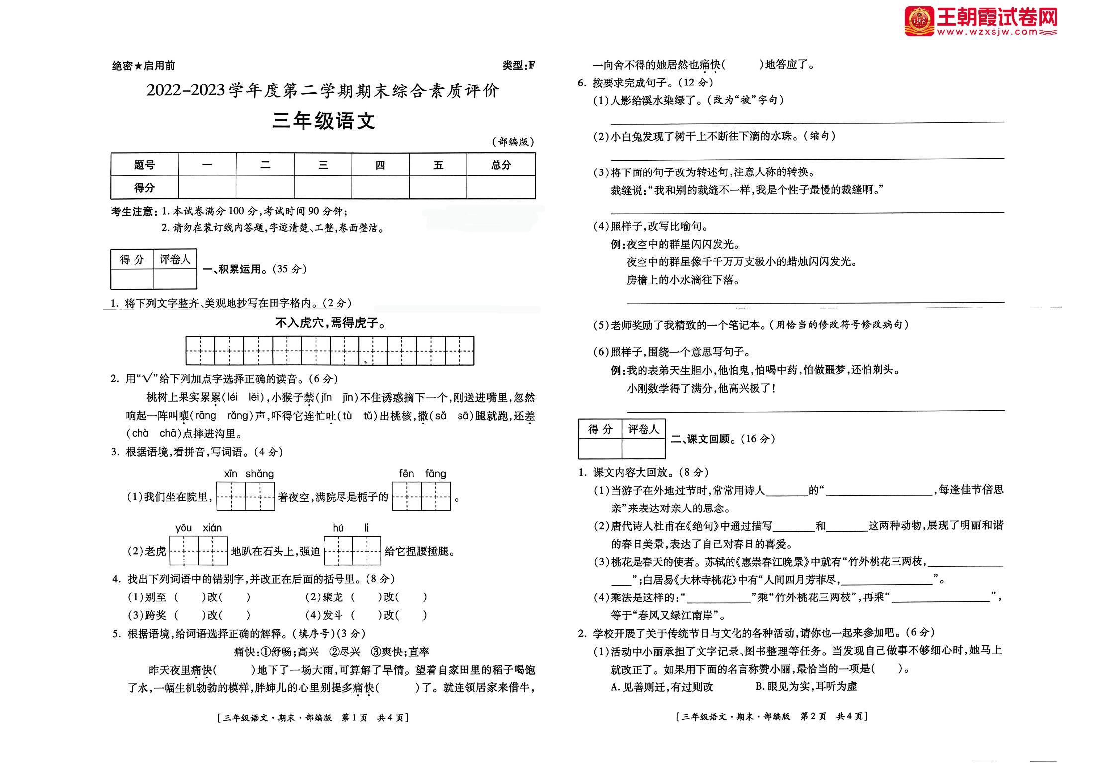 陕西省延安市富县2022-2023学年度第二学期期末综合素质评价三年级语文(人教版)