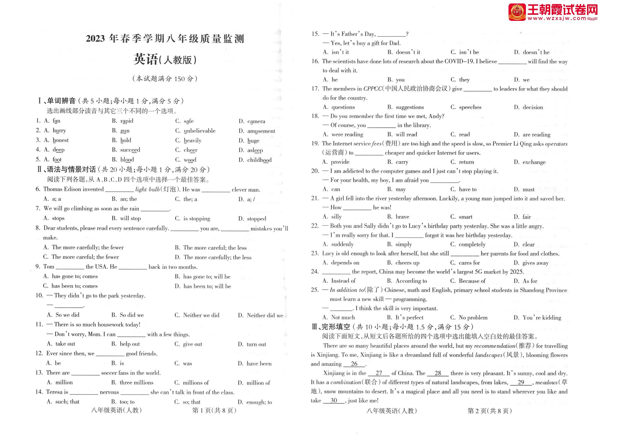 甘肃省陇南市成县2023年春季学期期末质量监测八年级英语(人教版)