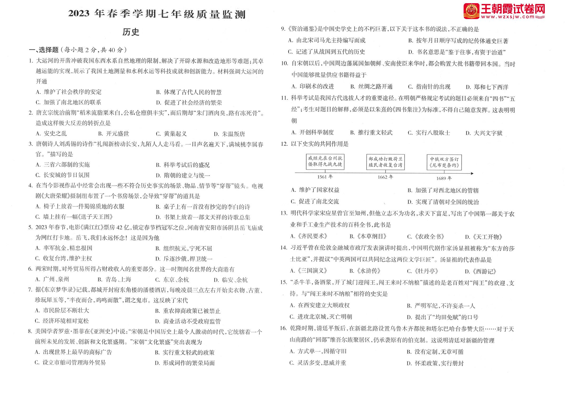 甘肃省陇南市成县2023年春季学期期末质量监测七年级历史(人教版)