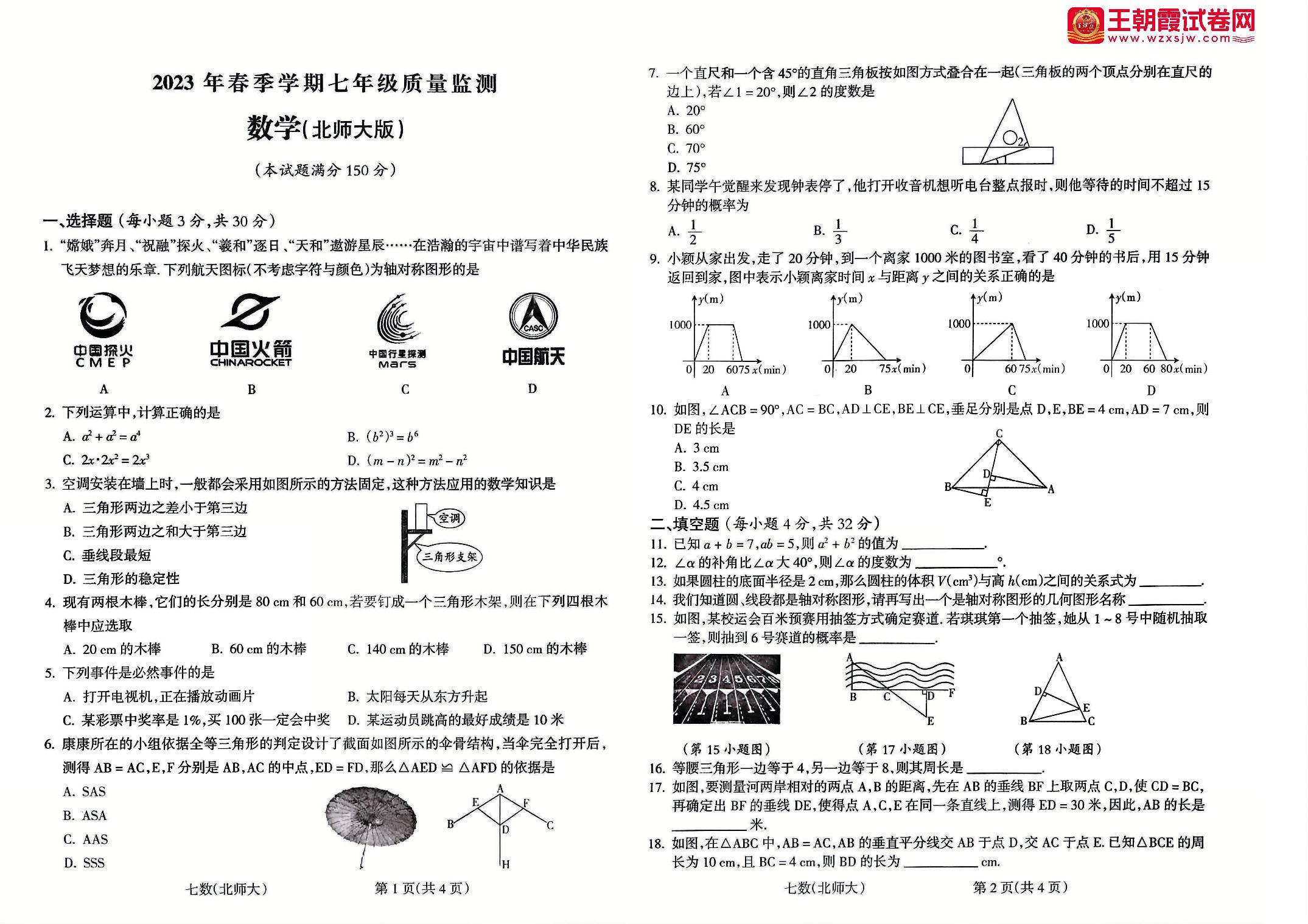 甘肃省陇南市成县2023年春季学期期末质量监测七年级数学(北师版)