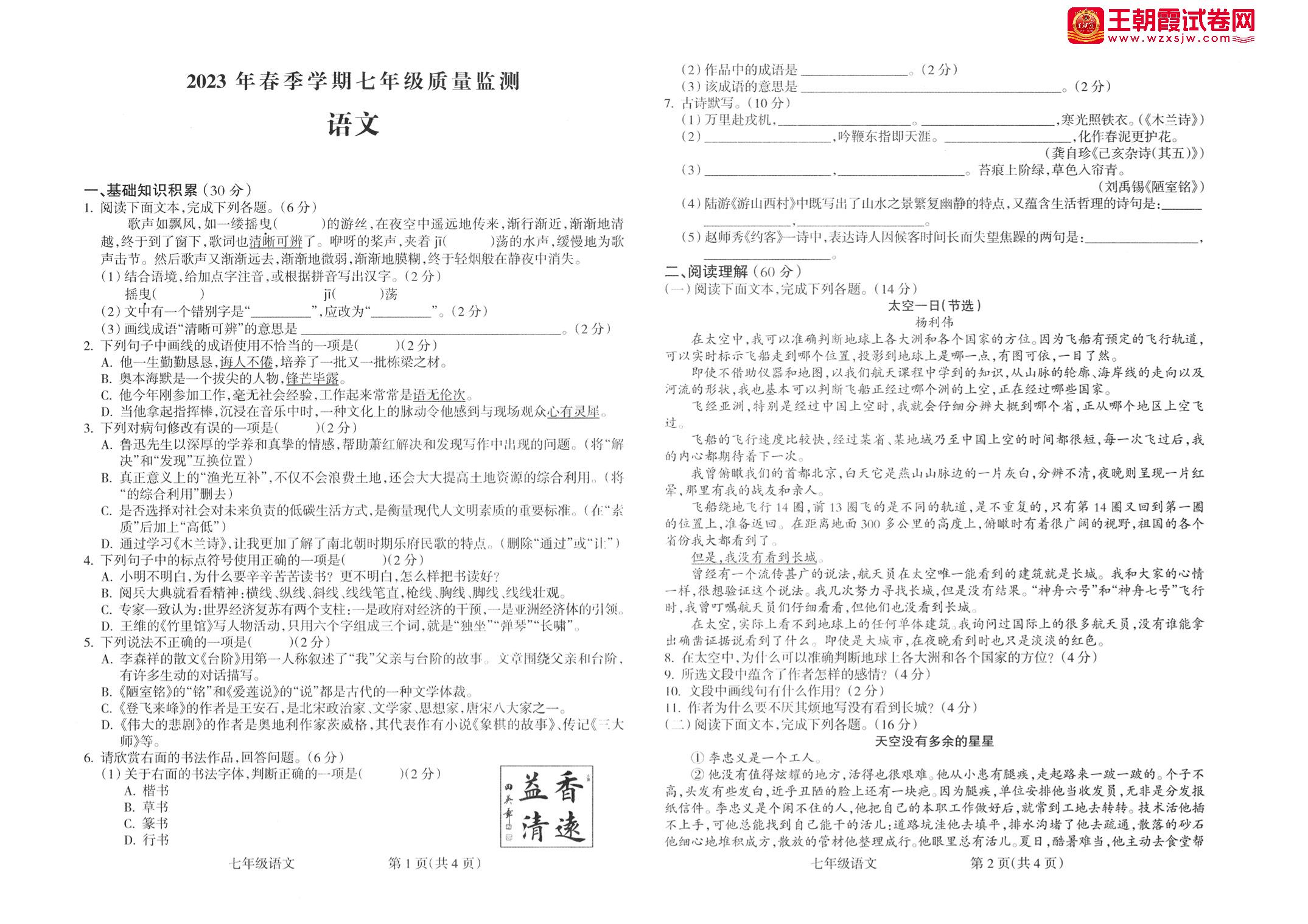 七年级语文人教版下册期末卷