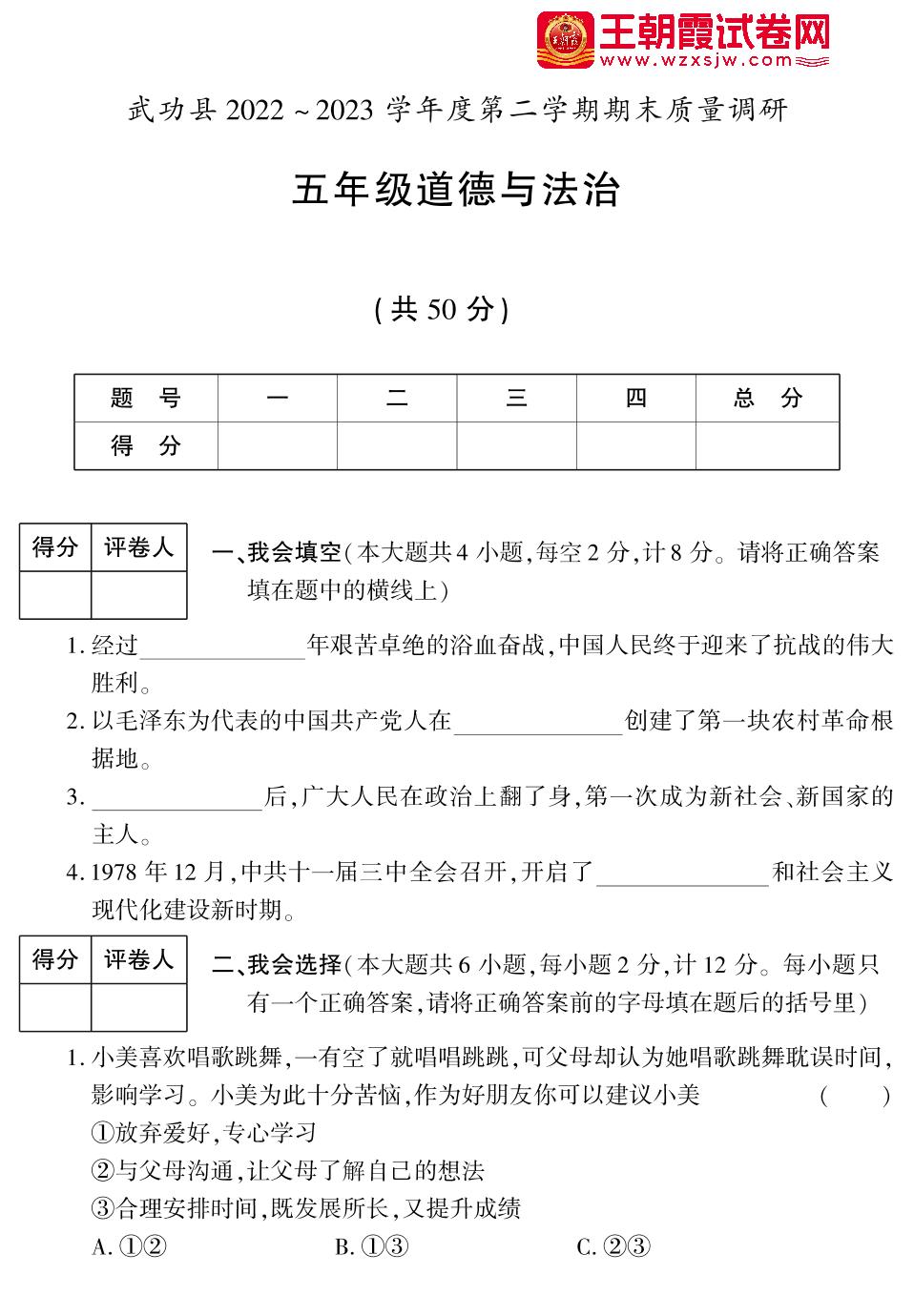陕西省咸阳市武功县2022-2023学年度第二学期期末质量调研五年级道德与法治(人教版)