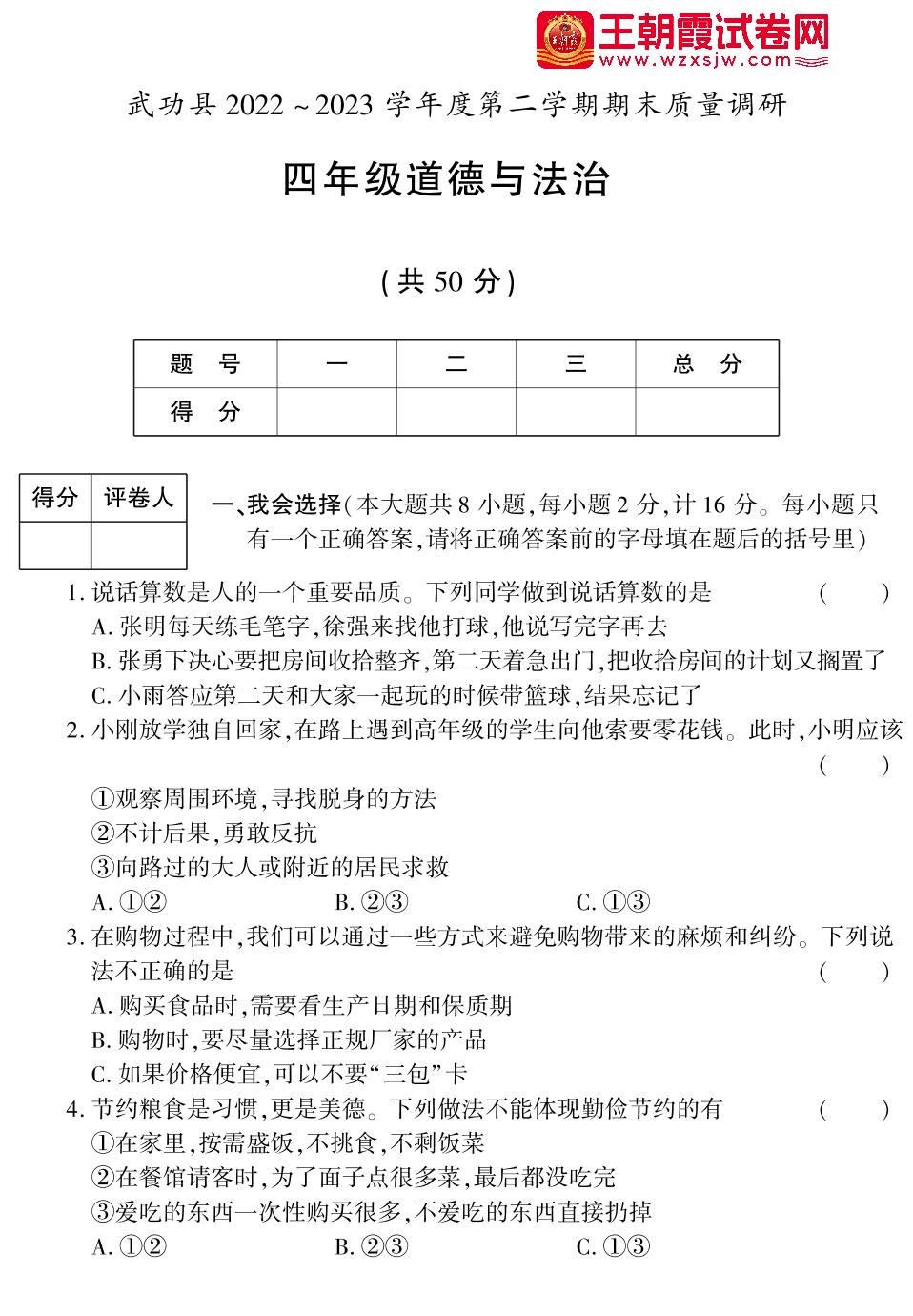 陕西省咸阳市武功县2022-2023学年度第二学期期末质量调研四年级道德与法治(人教版)