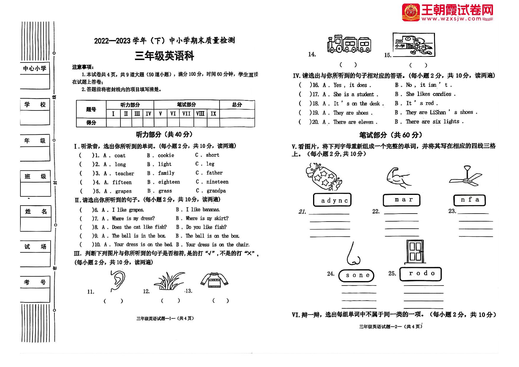 陕西省咸阳市泾阳县2022-2023学年(下)中小学期末质量检测三年级英语(陕旅版)【无听力音频】