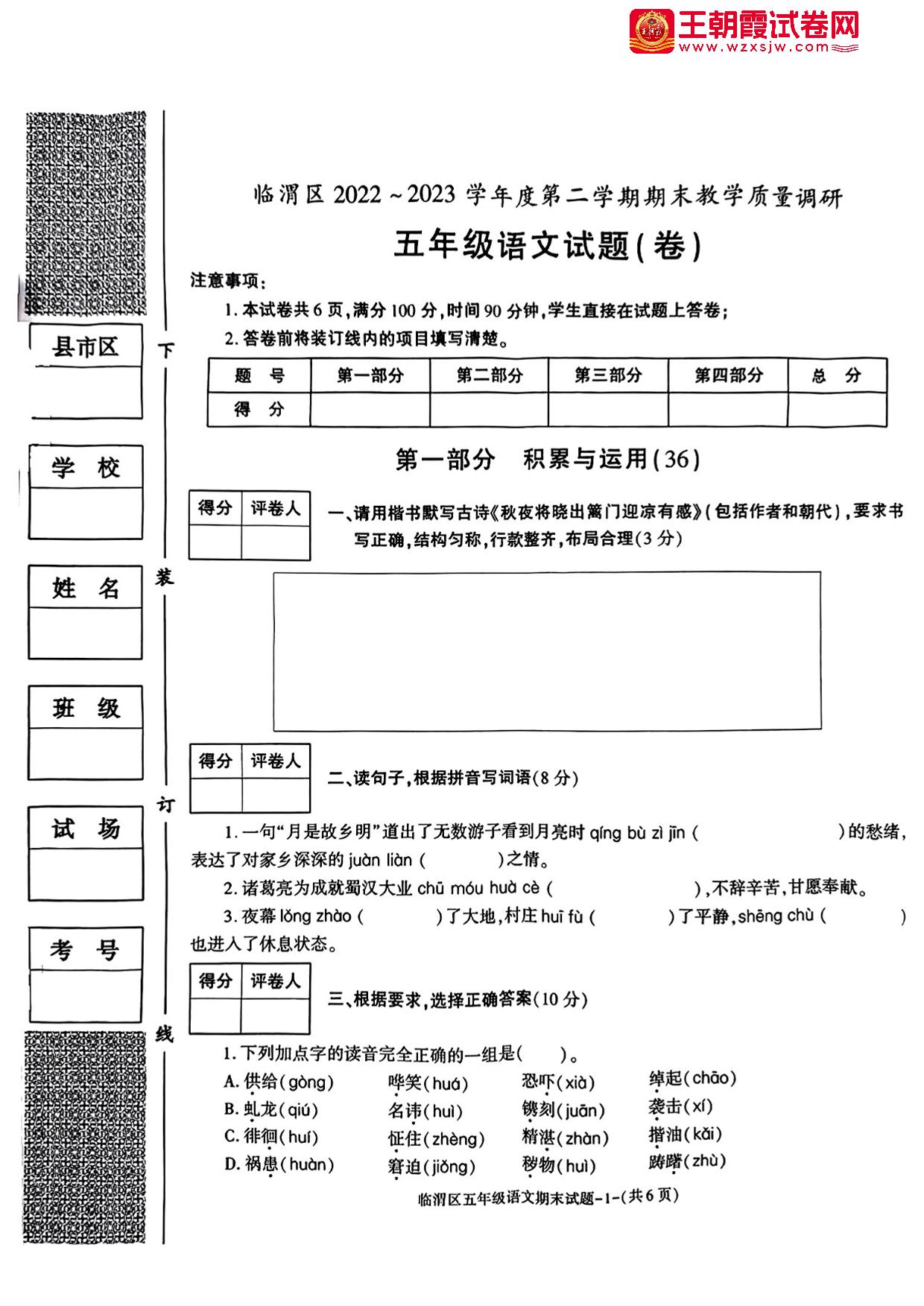陕西省渭南市临渭区2022-2023学年度第二学期期末教学质量调研五年级语文(人教版)