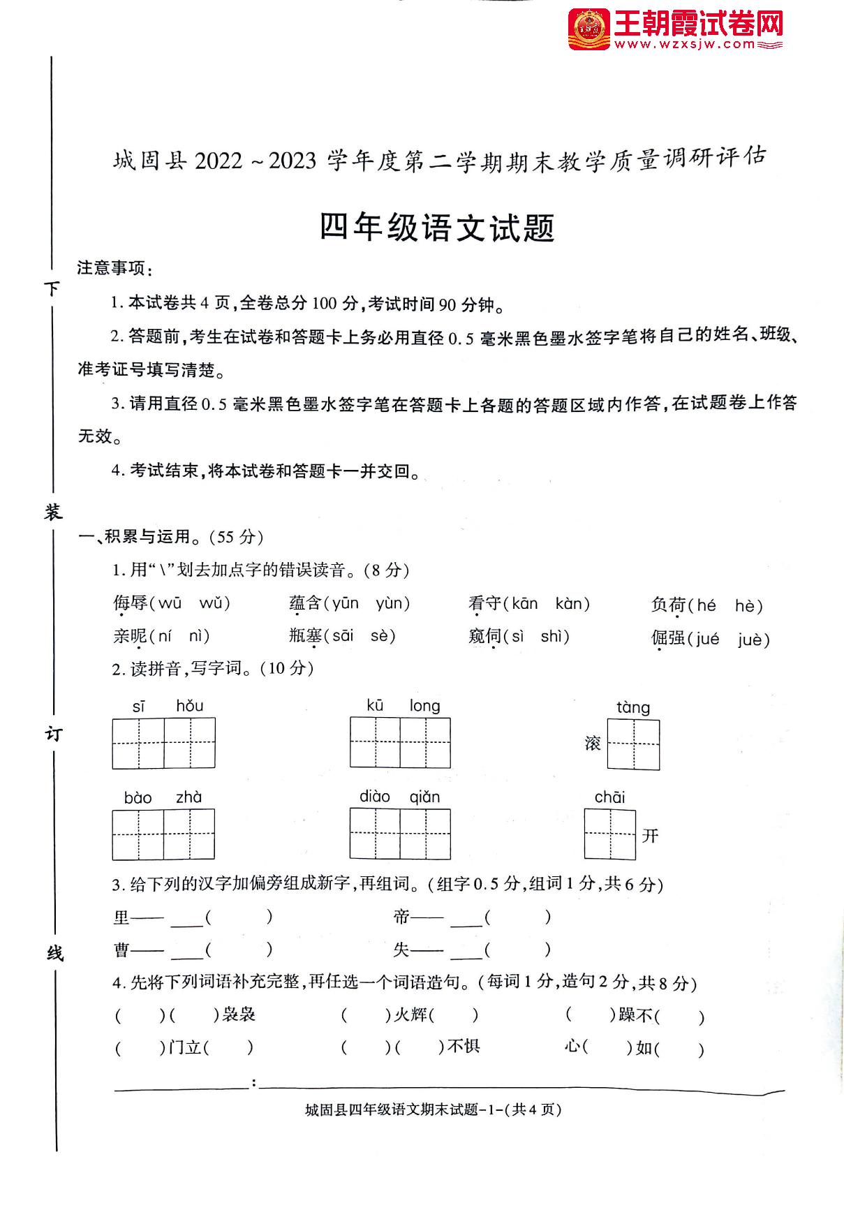 陕西省汉中市城固县2022-2023学年度第二学期期末教学质量调研评估四年级语文(人教版)