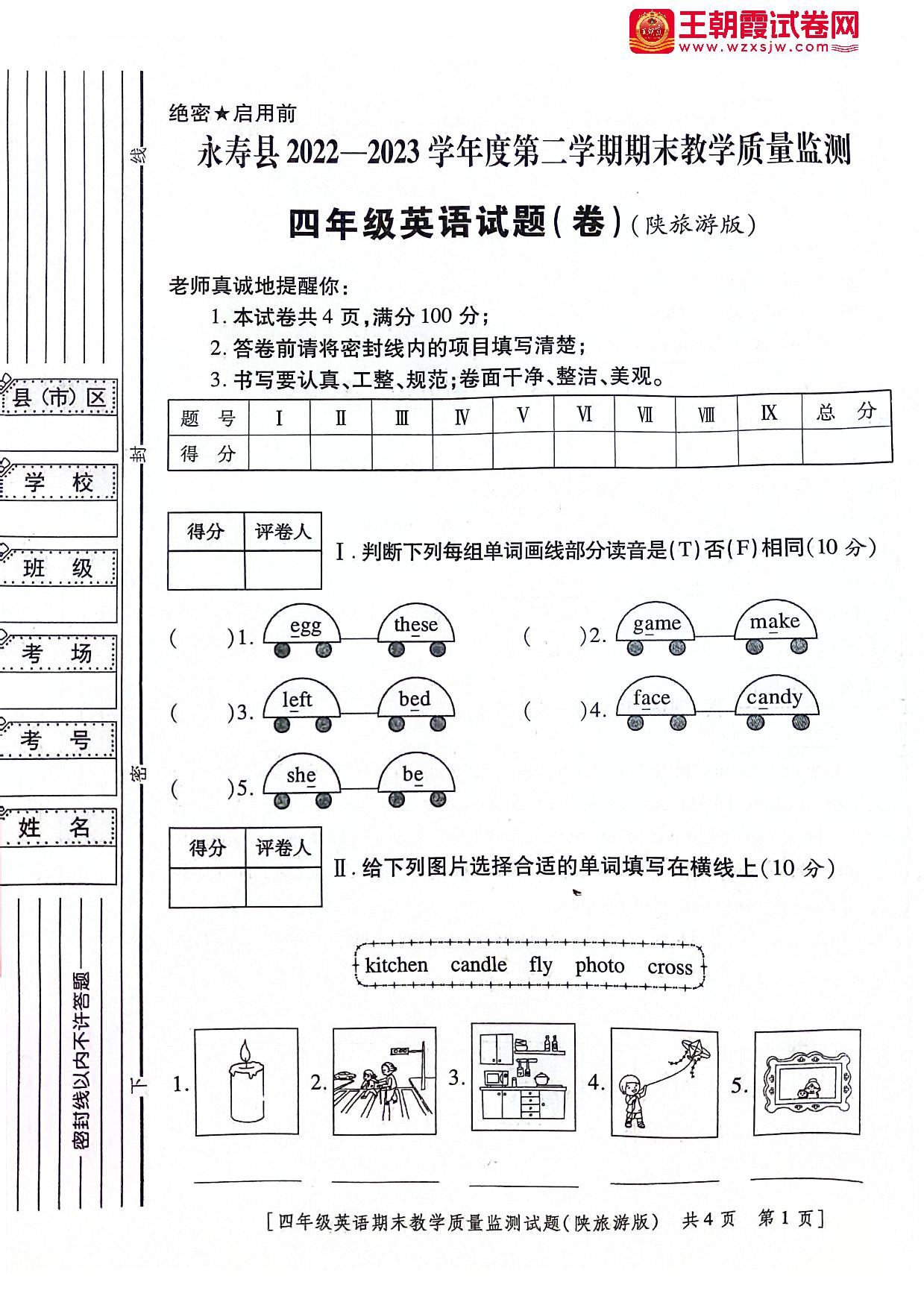 陕西省咸阳市永寿县2022-2023学年度第二学期期末教学质量监测四年级英语(陕旅版)