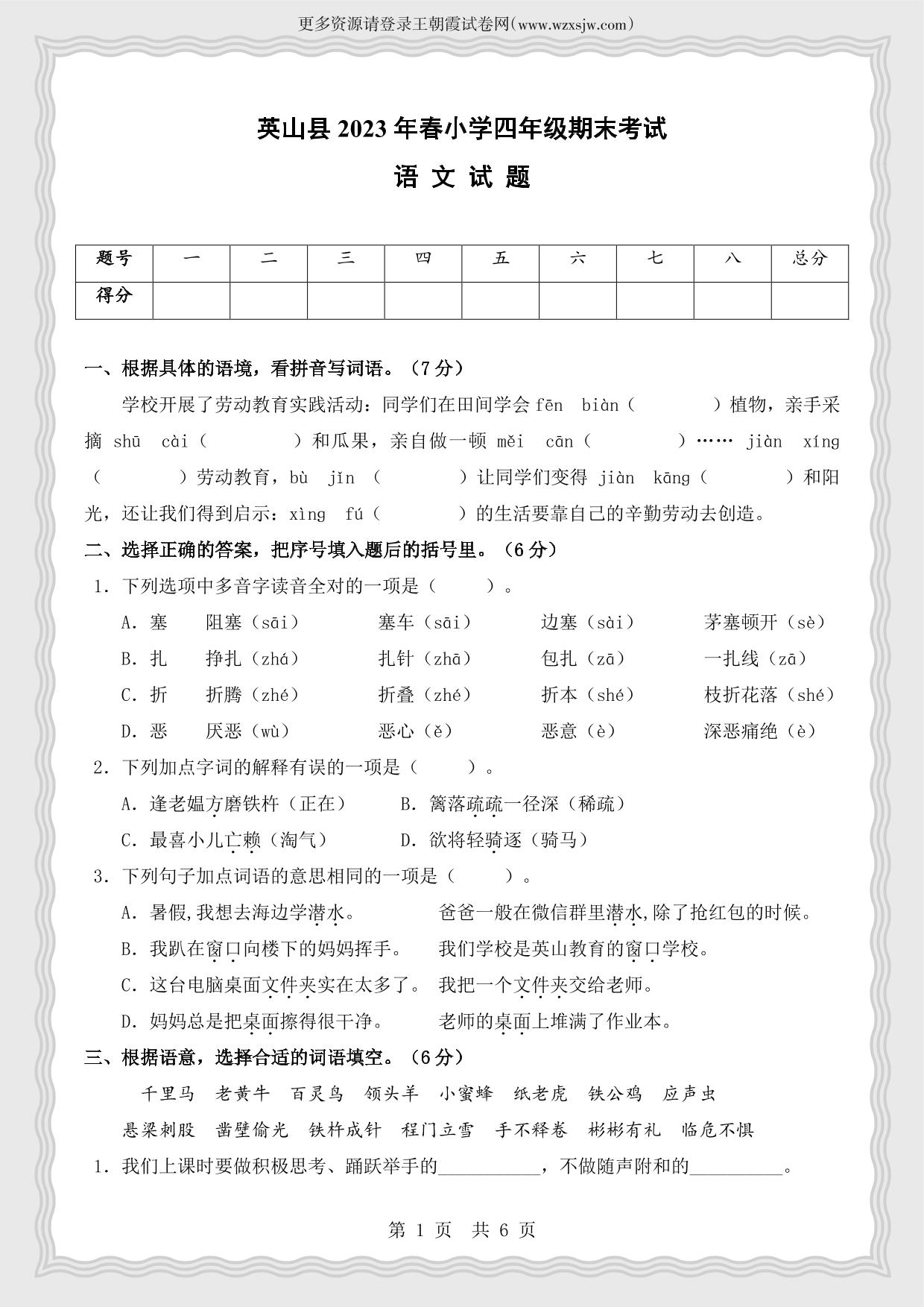 湖北省黄冈市英山县2022-2023学年下学期小学期末考试试题四年级语文(人教版)