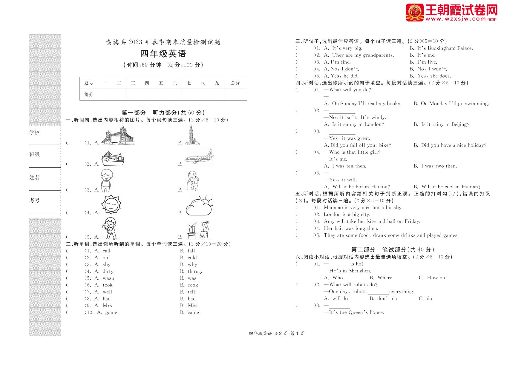 湖北省黄冈市黄梅县2023年春季期末质量检测试题四年级英语(外研版)【无听力音频】