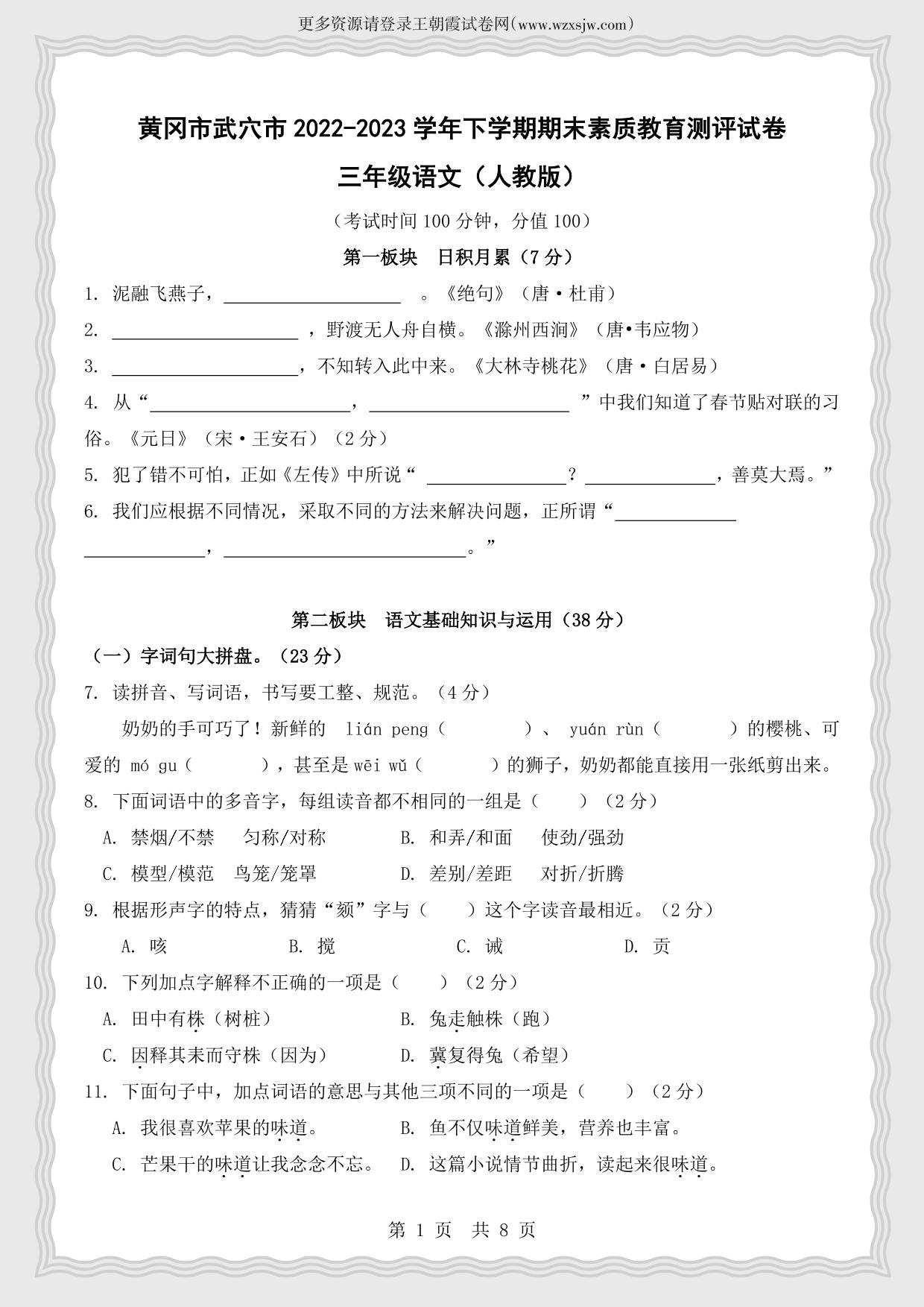 湖北省黄冈市武穴市2022-2023学年下学期期末素质教育测评试卷三年级语文(人教版)