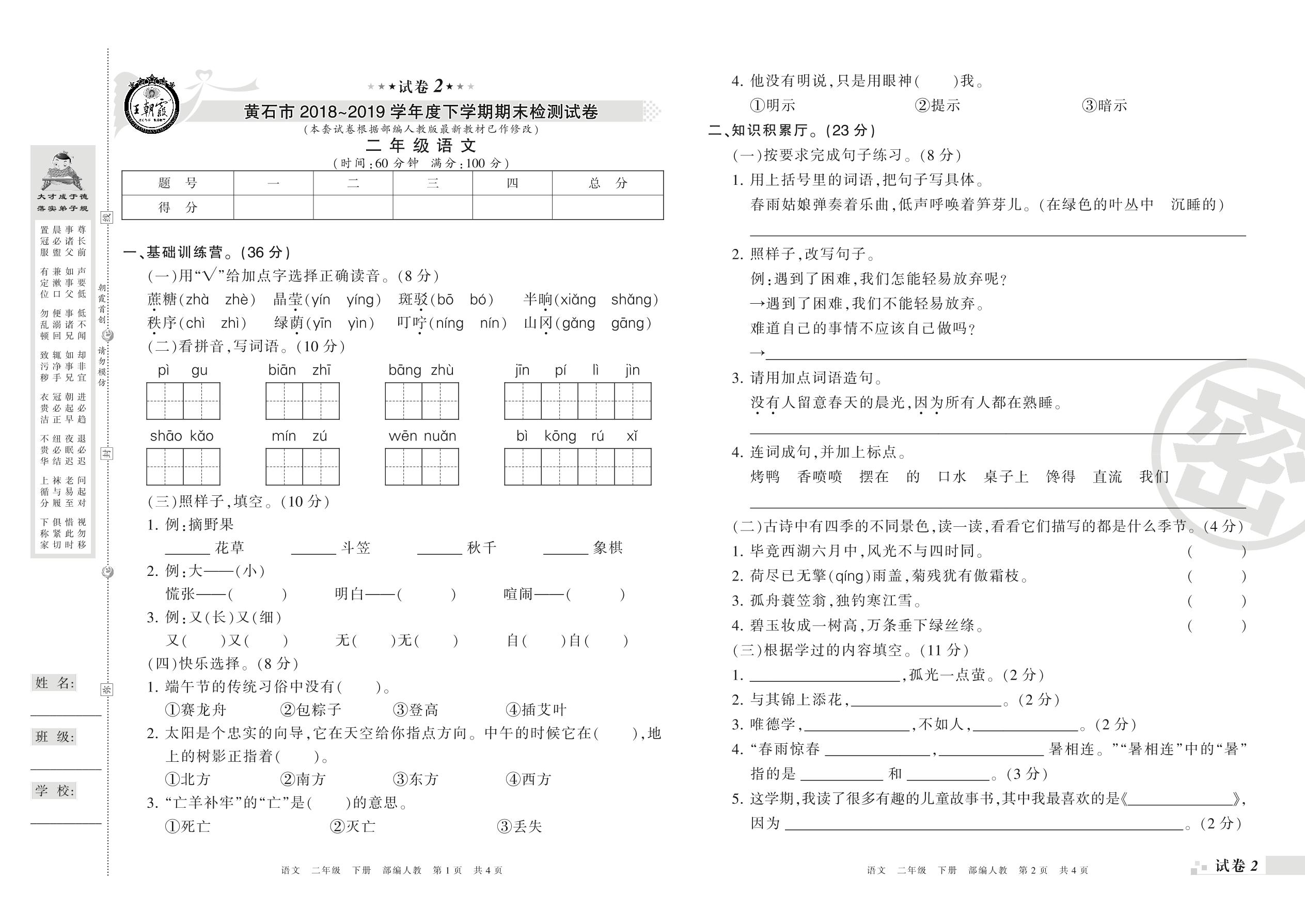 2018-2019学年第二学期黄石市二年级语文试卷(人教版)【2】
