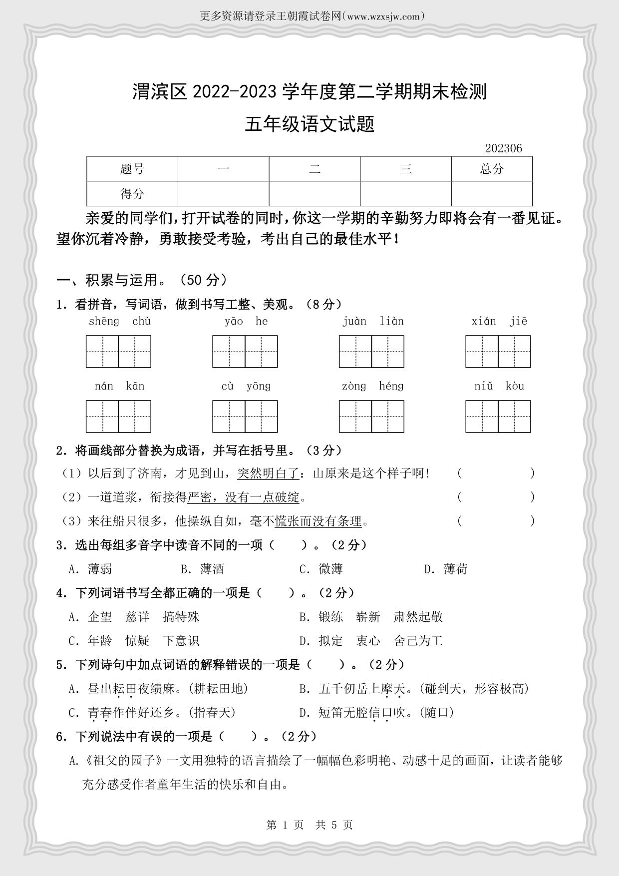 陕西省宝鸡市渭滨区2022-2023学年度第二学期期末检测试题五年级语文(人教版)