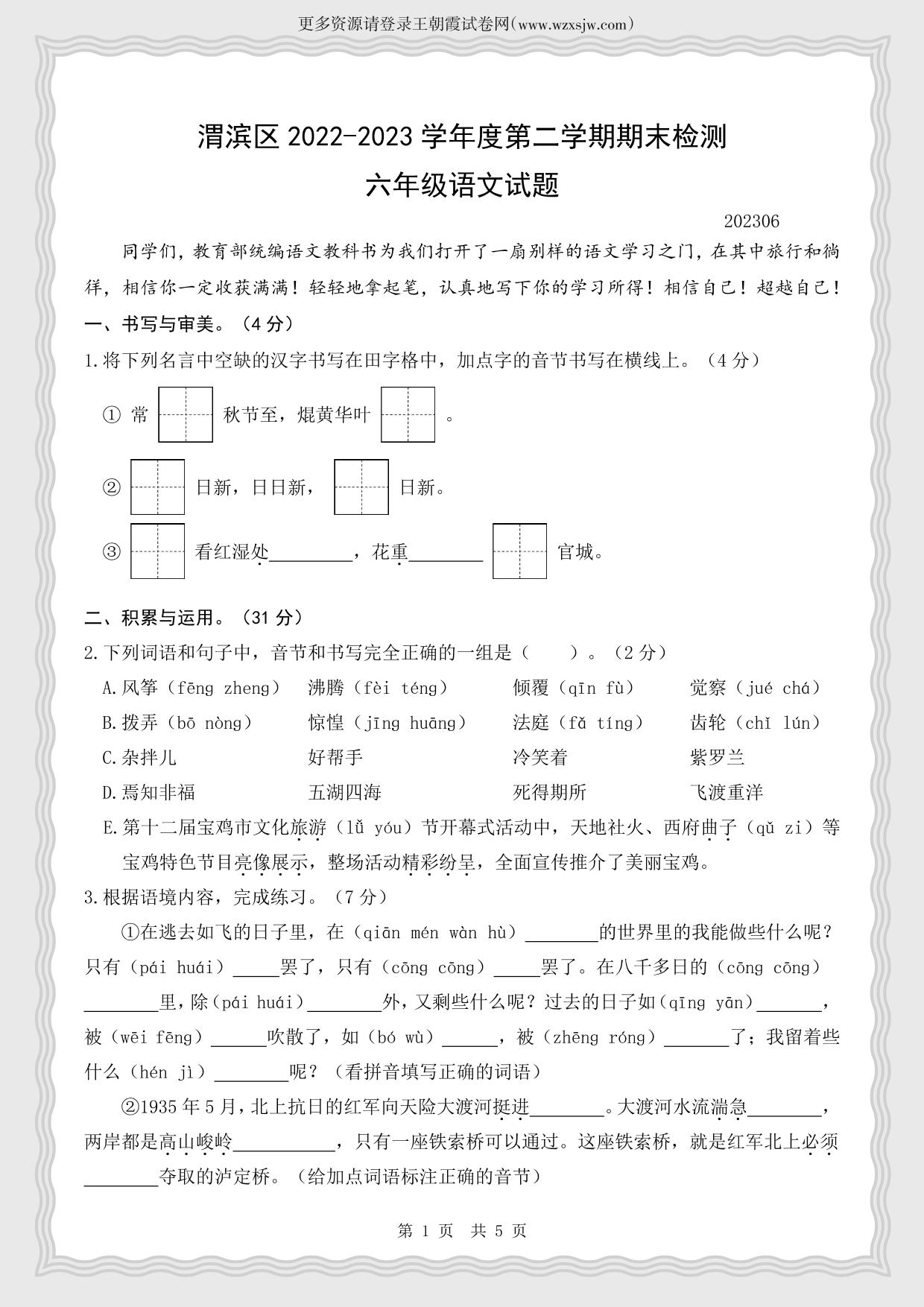 陕西省宝鸡市渭滨区2022-2023学年度第二学期期末检测试题六年级语文(人教版)