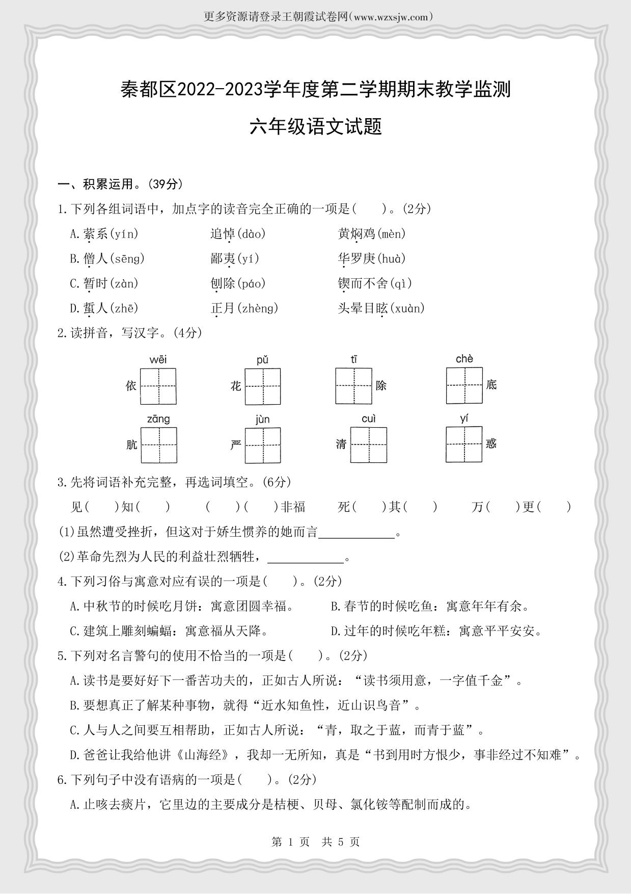 陕西省咸阳市秦都区2022-2023学年度第二学期期末教学监测试题六年级语文(人教版)