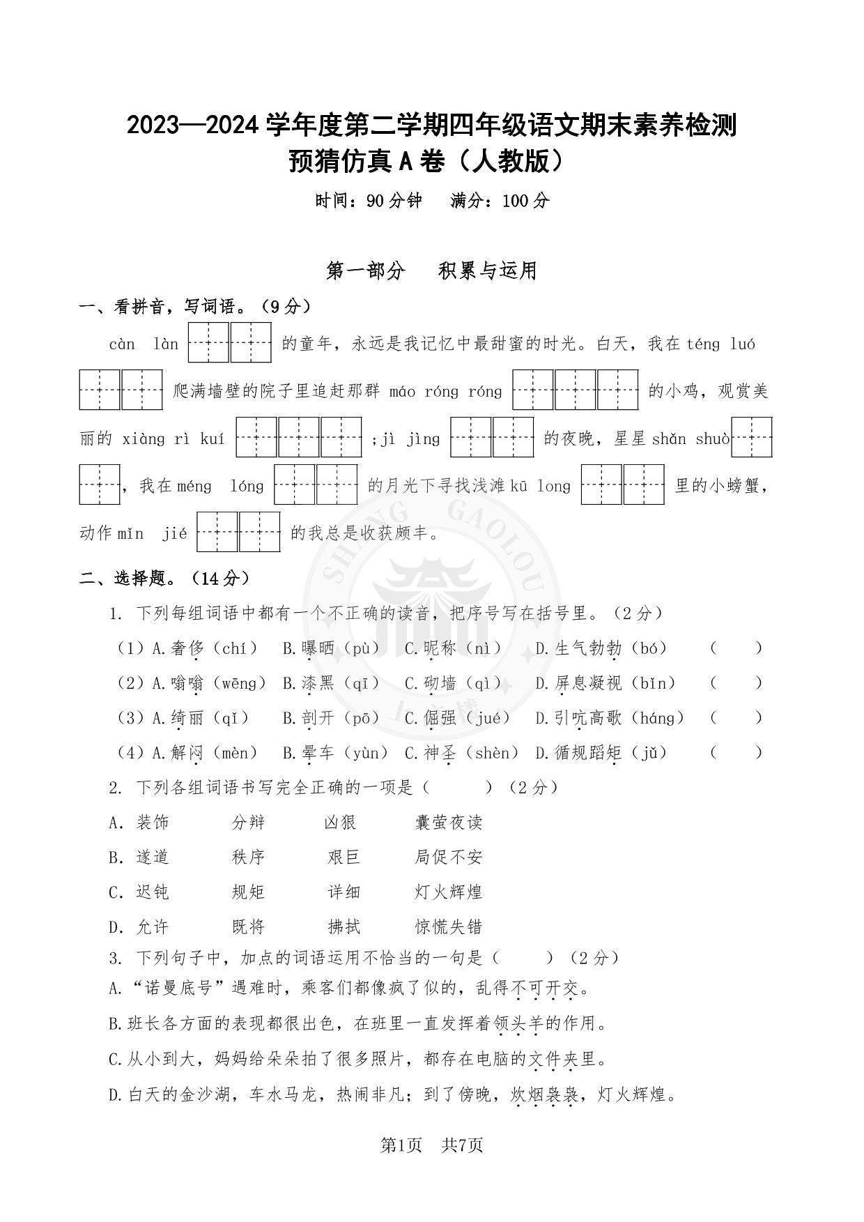 2023—2024学年第二学期四年级语文期末素养检测预猜仿真A卷(人教版)