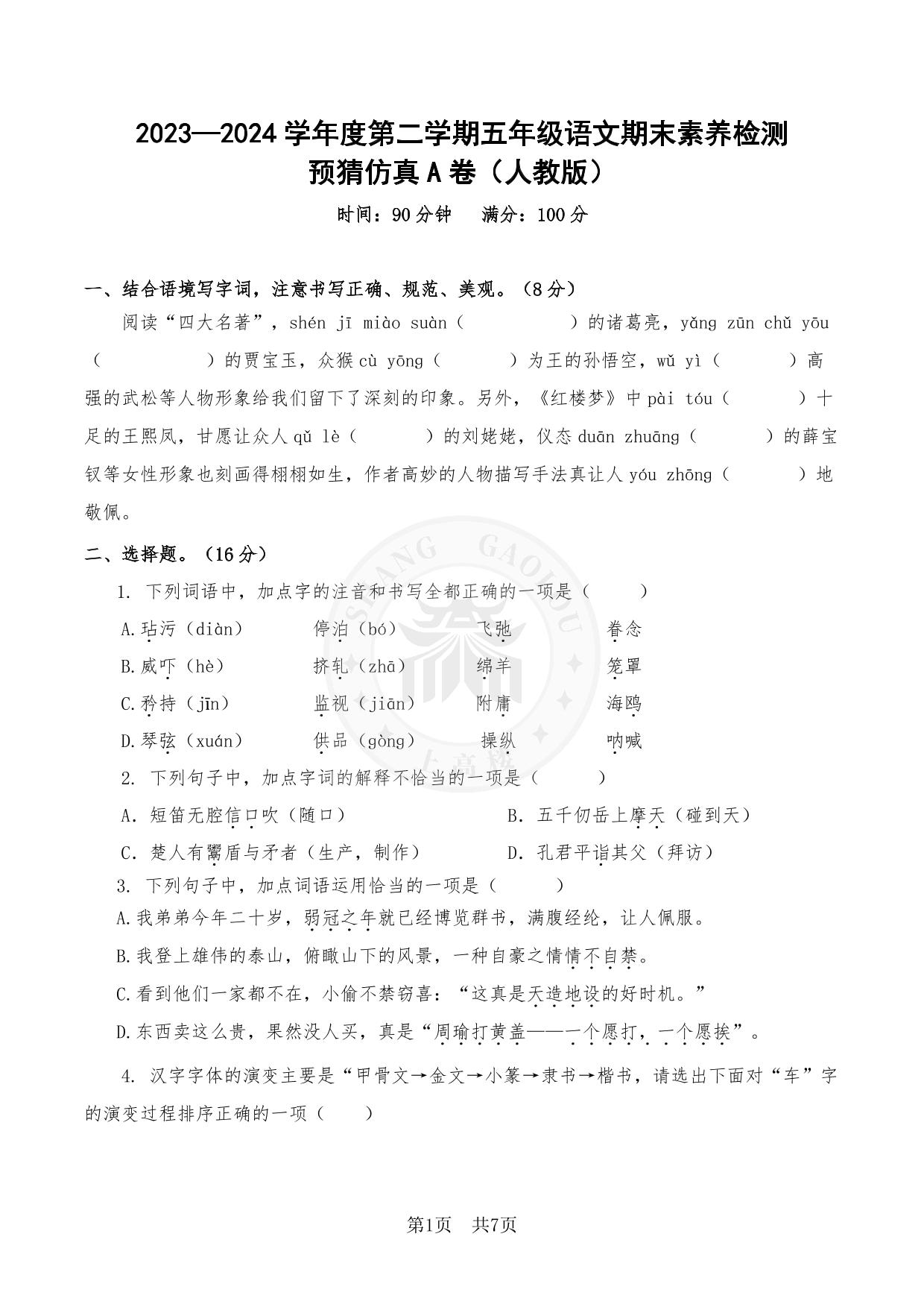 2023—2024学年第二学期五年级语文期末素养检测预猜仿真A卷(人教版)