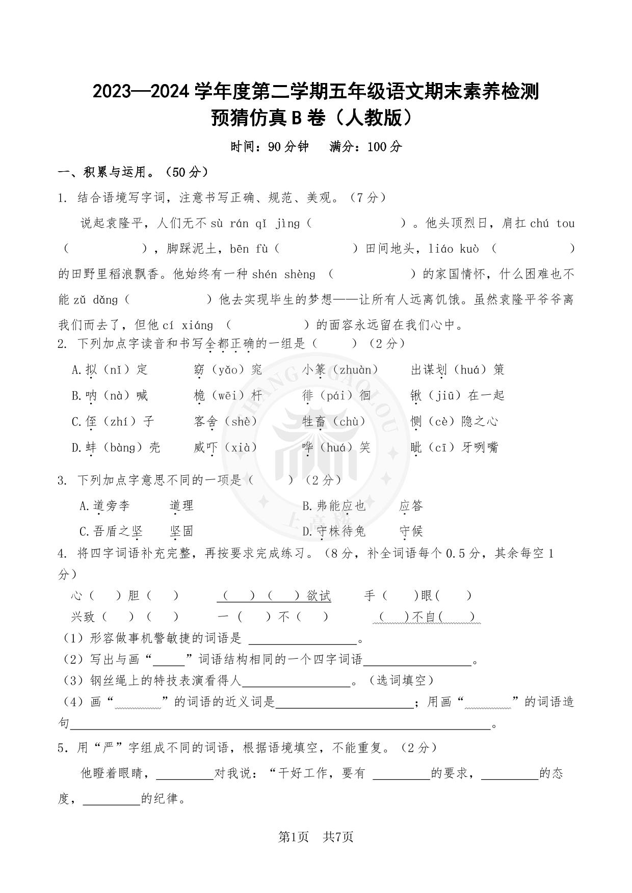 2023—2024学年第二学期五年级语文期末素养检测预猜仿真B卷(人教版)