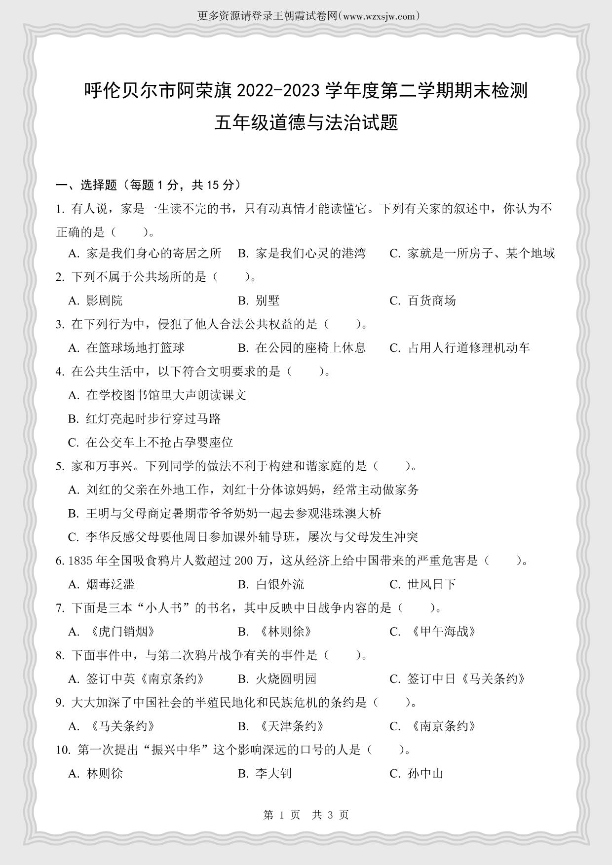 内蒙古自治区呼伦贝尔市阿荣旗2022-2023学年度第二学期期末检测试题五年级道德与法治(人教版)