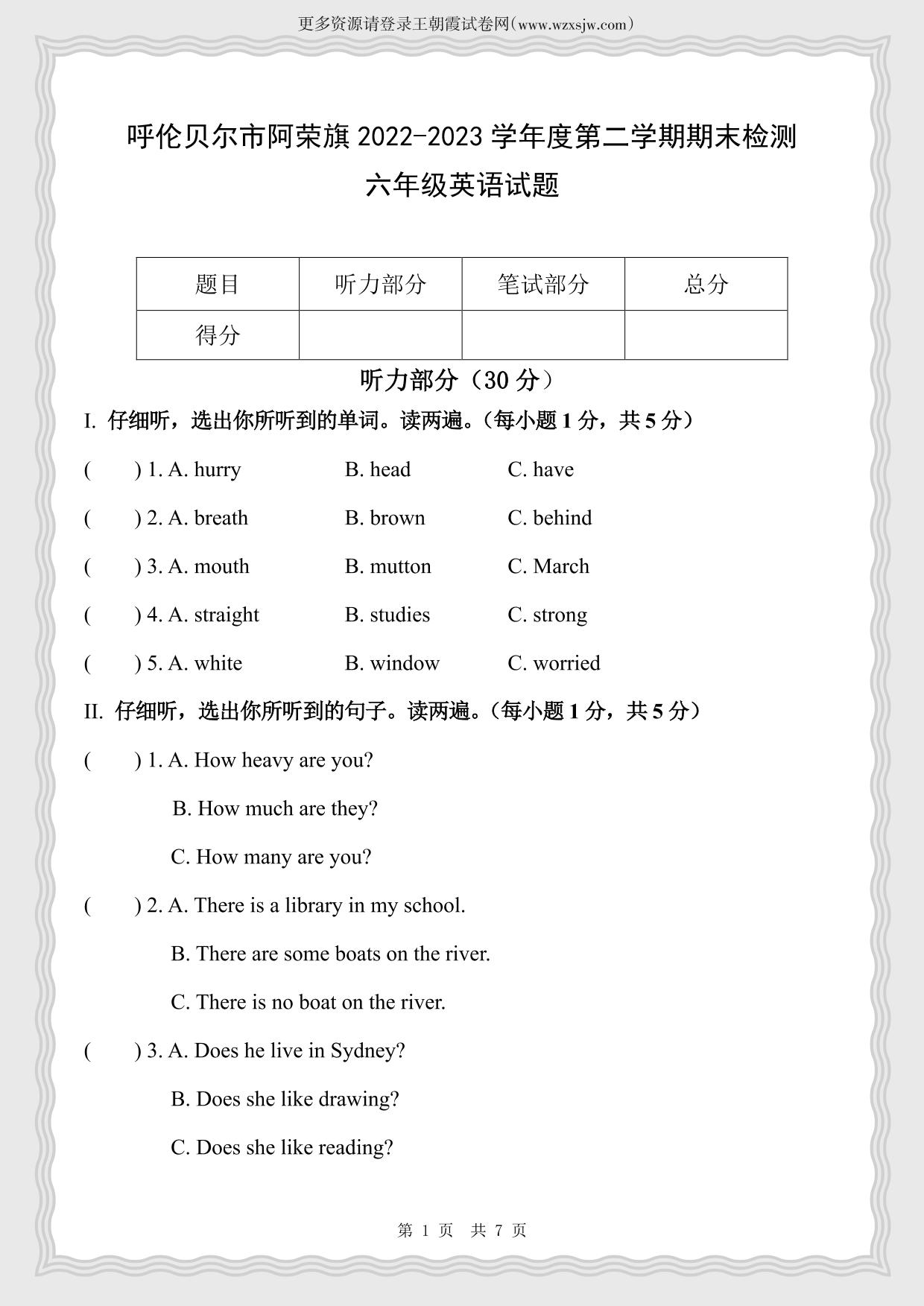 内蒙古自治区呼伦贝尔市阿荣旗2022-2023学年度第二学期期末检测试题六年级英语(人教PEP版)【无听力音频】
