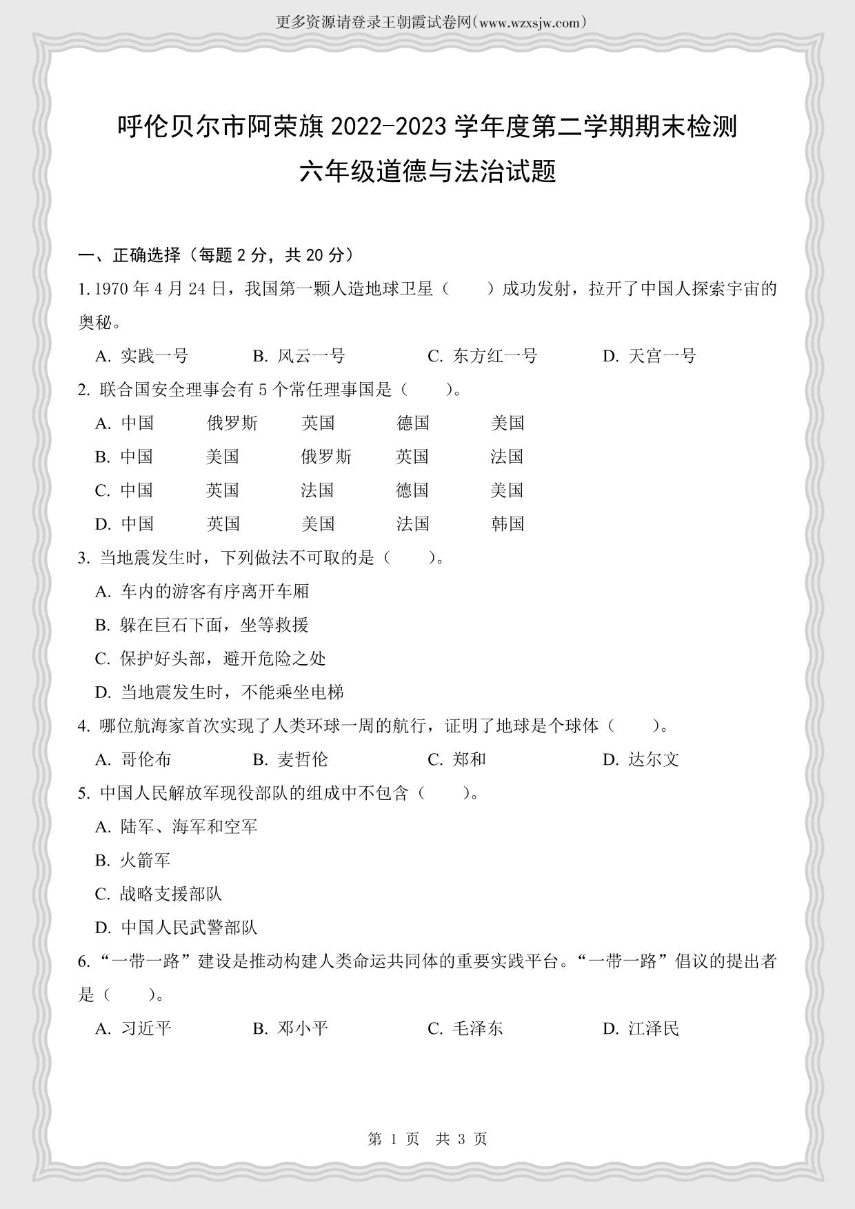 内蒙古自治区呼伦贝尔市阿荣旗2022-2023学年度第二学期期末检测试题六年级道德与法治(人教版)