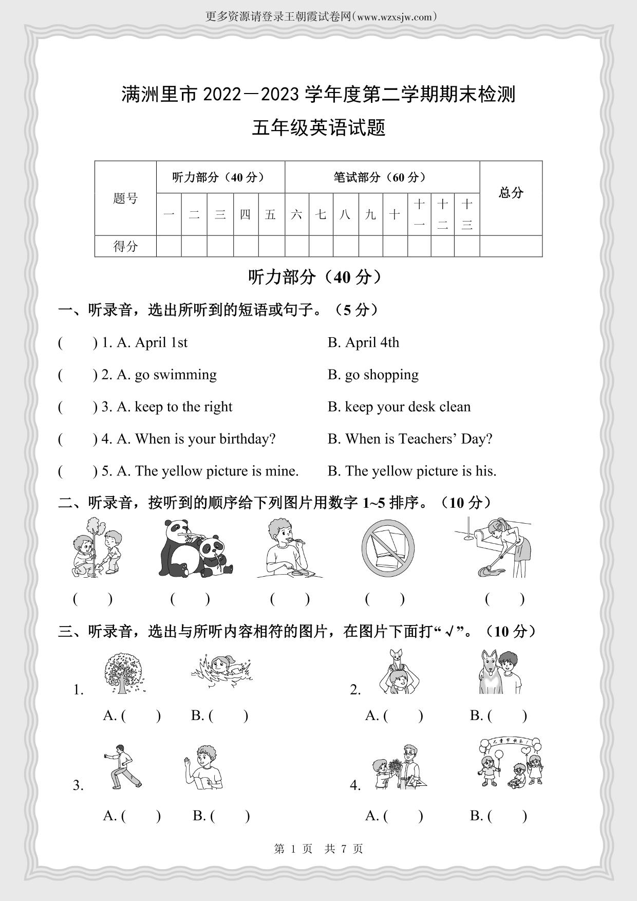 内蒙古自治区呼伦贝尔市满洲里市2022-2023学年度第二学期期末检测试题五年级英语(人教PEP版)