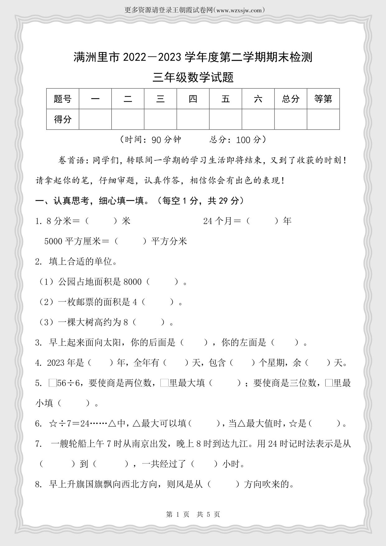 内蒙古自治区呼伦贝尔市满洲里市2022-2023学年度第二学期期末检测试题三年级数学(人教版)