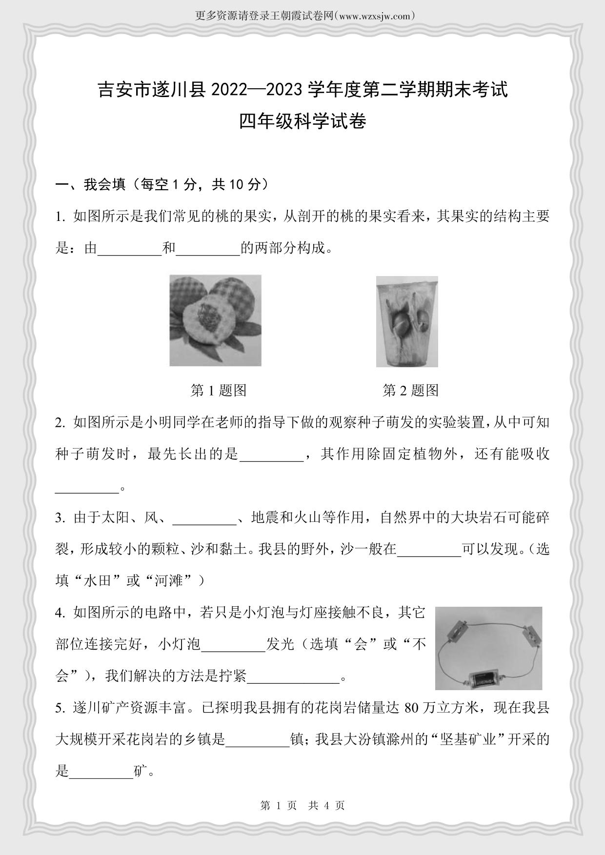 江西省吉安市遂川县2022-2023学年度第二学期期末考试试卷四年级科学(教科版)